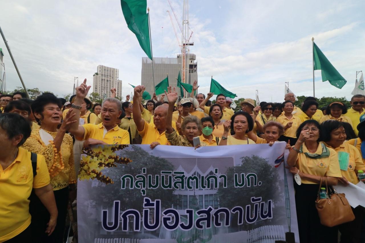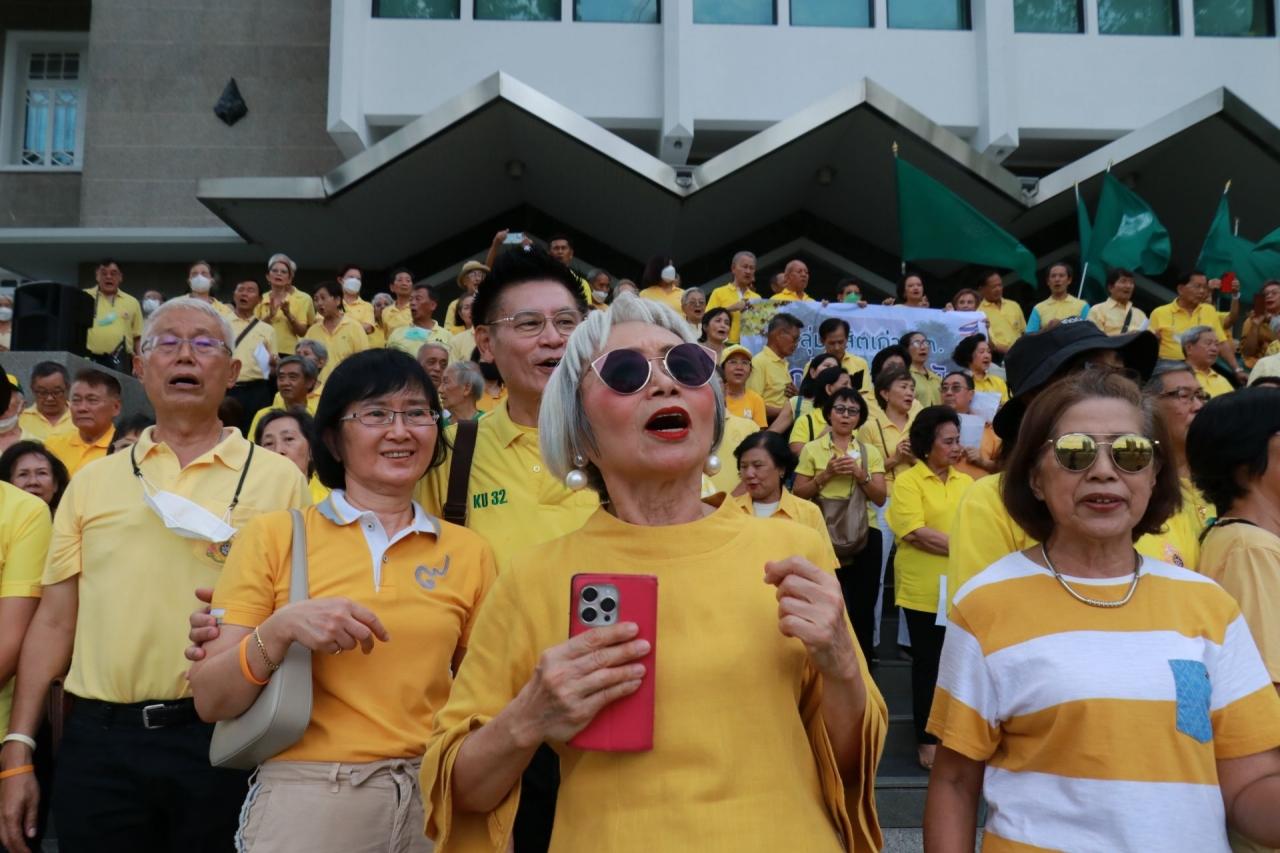 เมื่อเวลา 17.00 น. วันที่ 28 กรกฎาคม 2566 ผู้สื่อข่าวรายงานว่า ที่หน้าหอประชุมใหญ่มหาวิทยาลัยเกษตรศาสตร์ (มก.) บางเขน กลุ่มนิสิตเก่า มก. ซึ่งประกอบไปด้วยนิสิตเก่าอาวุโสจากหลายรุ่นหลายคณะ นำโดย ศ.ดร.อุทัยรัตน์ ณ นคร ศิษย์เก่า มก. รุ่น 30 นัดหมายรวมตัวสวมใส่เสื้อสีเหลือง เข้าร่วมเป็นกลุ่มนิสิต มก. ปกป้องสถาบัน เพื่อแสดงเจตจำนงในความรักชาติ ศาสนา และพระมหากษัตริย์ คัดค้านกิจกรรมชุมนุมของกลุ่มพรรคอาทิตย์ใหม่ มก. ที่มีการชักธงดำภายในรั้ว มก. ที่ถือเป็นการทำร้ายความรู้สึก โดยกิจกรรมมีการร่วมกันร้องเพลงประจำมหาวิทยาลัย จุดเทียน และร้องเพลงสดุดีจอมราชาเพื่อถวายพระพร
