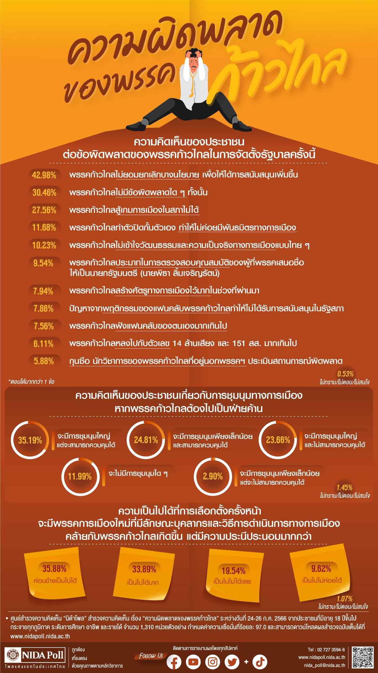 จากการสำรวจเมื่อถามถึงความคิดเห็นของประชาชนต่อข้อผิดพลาดของพรรคก้าวไกลในการจัดตั้งรัฐบาลครั้งนี้พบว่า ตัวอย่างร้อยละ 42.98 ระบุว่า พรรคก้าวไกล ไม่ยอมยกเลิกบางนโยบายเพื่อให้ได้การสนับสนุนเพิ่มขึ้น รองลงมาร้อยละ 30.46 ระบุว่า พรรคก้าวไกล ไม่มีข้อผิดพลาดใดๆ ทั้งนั้น ร้อยละ 27.56 ระบุว่า พรรคก้าวไกลสู้เกมการเมืองในสภาไม่ได้ ร้อยละ 11.68 ระบุว่า พรรคก้าวไกลทำตัวปิดกั้นตัวเอง ทำให้ไม่ค่อยมีพันธมิตรทางการเมือง ร้อยละ 10.23 ระบุว่า พรรคก้าวไกลไม่เข้าใจวัฒนธรรมและความเป็นจริงทางการเมืองแบบไทยๆ ร้อยละ 9.54 ระบุว่า พรรคก้าวไกลประมาทในการตรวจสอบคุณสมบัติของผู้ที่พรรคเสนอชื่อให้เป็นนายกรัฐมนตรี (นายพิธา ลิ้มเจริญรัตน์) ร้อยละ 7.94 ระบุว่า พรรคก้าวไกลสร้างศัตรูทางการเมืองไว้มากในช่วงที่ผ่านมา ร้อยละ 7.86 ระบุว่า ปัญหาจากพฤติกรรมของแฟนคลับพรรคก้าวไกล ทำให้ไม่ได้รับการสนับสนุนในรัฐสภา ร้อยละ 7.56 ระบุว่า พรรคก้าวไกล ฟังแฟนคลับของตนเองมากเกินไป ร้อยละ 6.11 ระบุว่า พรรคก้าวไกลหลงไปกับตัวเลข 14 ล้านเสียง และ 151 สส. มากเกินไป ร้อยละ 5.88 ระบุว่า กุนซือ นักวิชาการของพรรคก้าวไกลที่อยู่นอกพรรคฯ ประเมินสถานการณ์ผิดพลาด และร้อยละ 0.53 ระบุว่า ไม่ทราบ/ไม่ตอบ/ไม่สนใจ