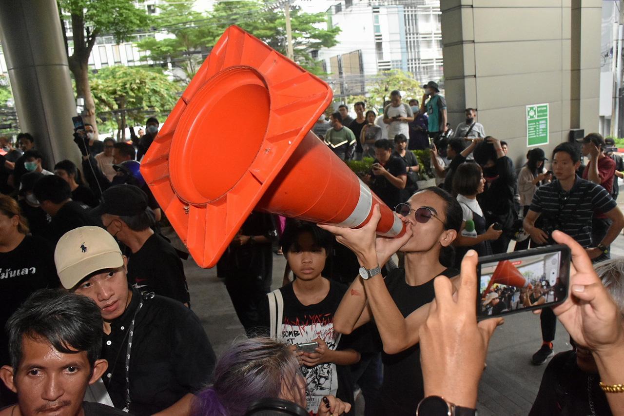 ต่อมาเวลา 15.30 น. หลังทราบว่าพรรค พท.ฉีกเอ็มโอยู 8 พรรคร่วมจัดตั้งรัฐบาลให้พรรค ก.ก.ไปเป็นฝ่ายค้าน มวลชนคาร์ม็อบกลุ่มทะลุวัง นำโดยบุ้ง ทะลุวัง และน้องหยก เยาวชนผู้ต้องหาคดี 112 พร้อมมวลชนได้นำหุ่นมาวางหน้าทางขึ้นอาคาร AOI Tower ที่ทำการพรรค พท.ก่อนสาดด้วยน้ำสีแดง ระบุว่าเป็นเลือดหมู ราดน้ำมันจุดไฟเผาจนเกิดความโกลาหล บางส่วนนำสีแดงเหมือนเลือดสาดไปยังตัวอาคาร เพื่อต้องการยื่นหนังสือถึงพรรค พท.ให้กลับมาร่วมมือกับพรรค ก.ก.จัดตั้งรัฐบาลอีกครั้ง โดยกลุ่มผู้ชุมนุมได้นำรถเครื่องเสียงมาจอดหน้าอาคารทางขึ้น โดยอ้างว่าให้เจ้าสาวซึ่งเป็นพรรคเพื่อไทยมารับขันหมากจากเจ้าบ่าว ซึ่งระหว่างรอกลุ่มผู้ชุมนุมยังตะโกนด่าทอพรรคเพื่อไทยด้วยคำหยาบคาย จากนั้นกลุ่มผู้ชุมนุมได้ส่งตัวแทนยื่นหนังสือถึงพรรคเพื่อไทย เพื่อให้พรรคเพื่อไทยและพรรคก้าวไกลจัดตั้งรัฐบาลร่วมกัน ขณะที่พรรคเพื่อไทยก็ได้ส่งเจ้าหน้าที่ลงมารับหนังสือ
