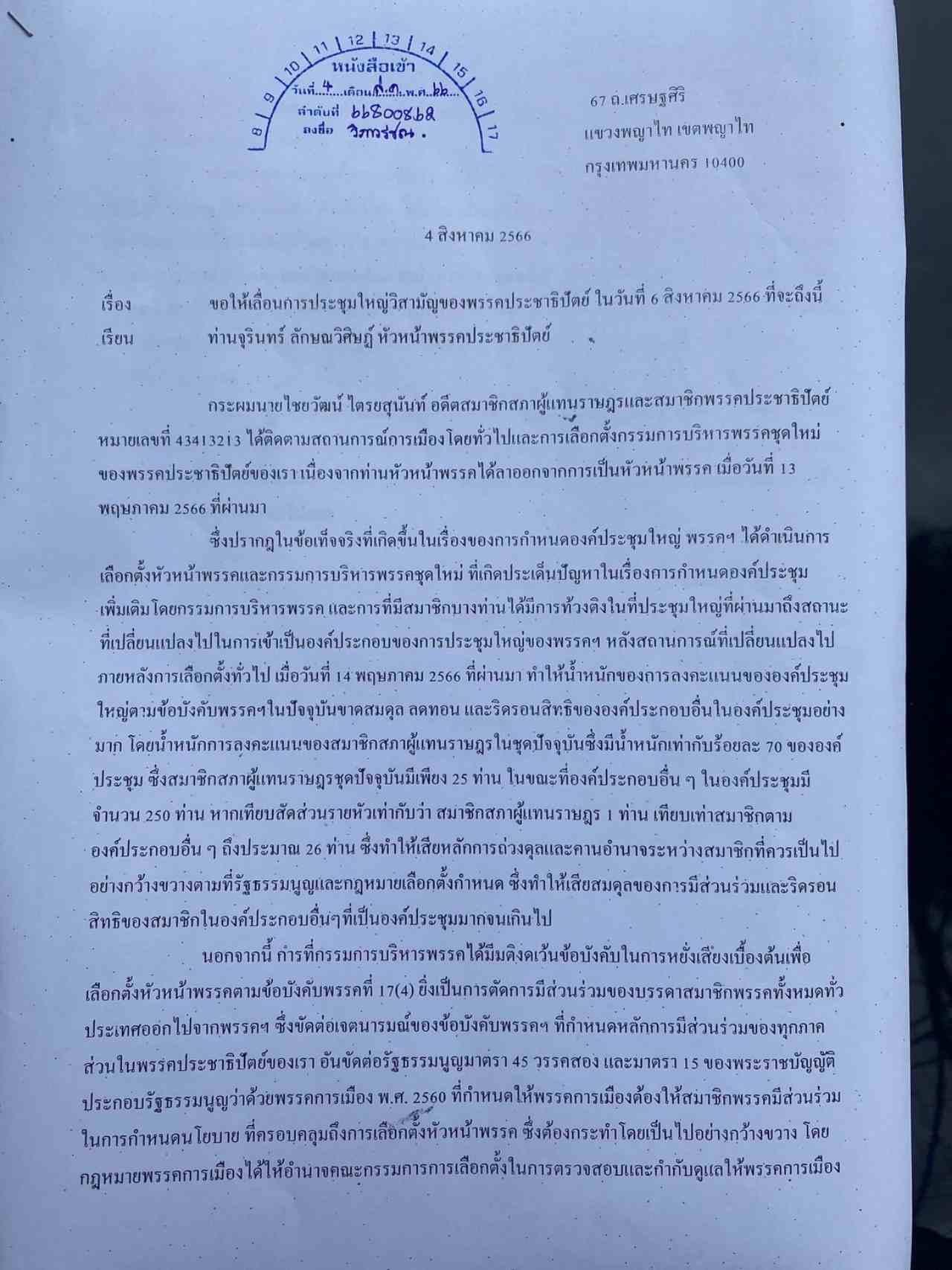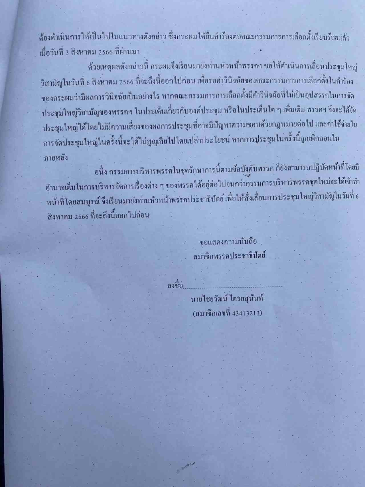 เมื่อเวลา 14.30 น. วันที่ 4 ส.ค. 2566 นายไชยวัฒน์ ไตรยสุนันท์ อดีต สส.พรรคประชาธิปัตย์ (ปชป.) เดินทางมาที่ทำการพรรค ปชป. เพื่อยื่นหนังสือถึงนายจุรินทร์ ลักษณวิศิษฏ์ ในฐานะรักษาการหัวหน้าพรรคเพื่อขอให้เลื่อนการประชุมใหญ่วิสามัญของพรรค ที่คณะกรรมการบริหารพรรค (กก.บห.) มีมติให้จัดขึ้นในวันที่ 6 ส.ค.นี้ เพื่อเลือกหัวหน้าพรรคและ กก.บห.พรรคชุดใหม่ออกไปก่อน โดยได้ยื่นผ่านเจ้าหน้าที่พรรค เพราะไม่มีผู้บริหาร หรือ ผอ.พรรค อยู่ที่พรรค