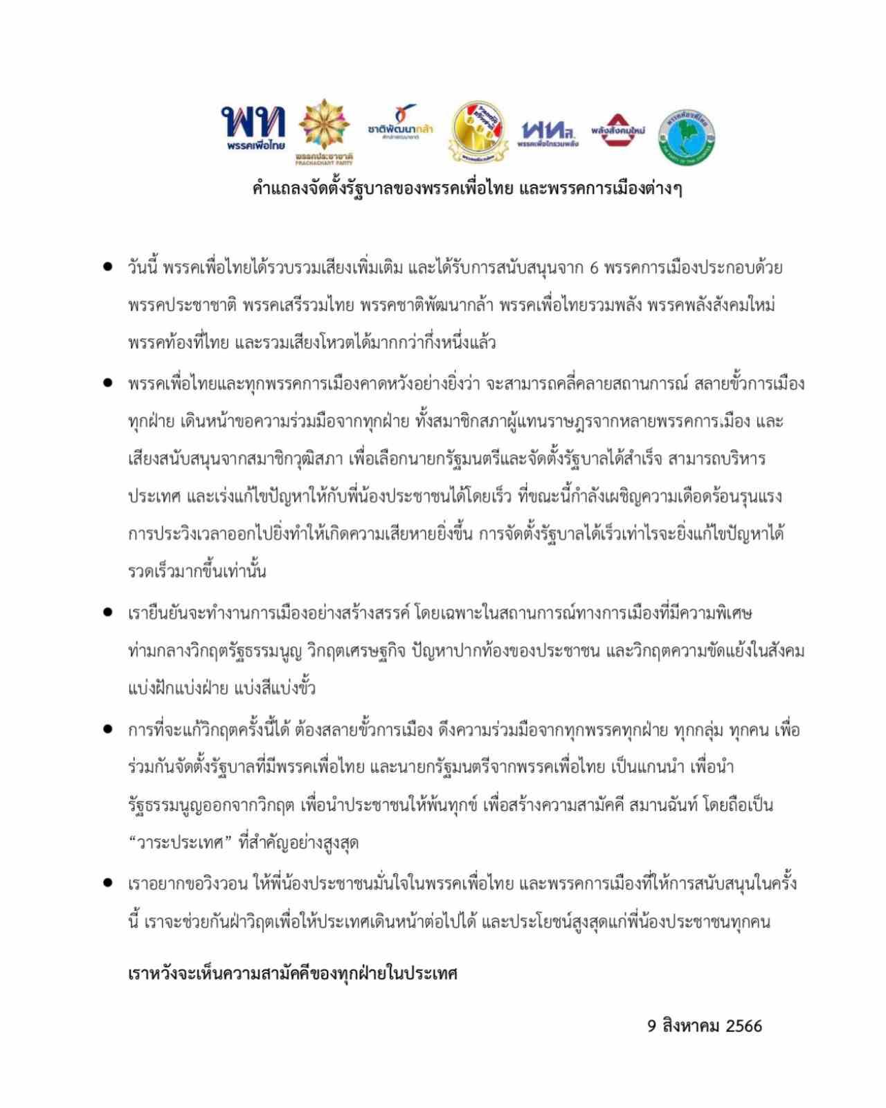 เพื่อไทย นำ 6 พรรคประกาศจัดตั้งรัฐบาล รวมเสียงเพิ่มมั่นใจ สลายขั้วการเมือง ได้เสียงข้างมากในสภาแล้ว เป็นแกนนำจัดตั้งรัฐบาล และมีนายกฯ มาจากพรรคเพื่อไทย
