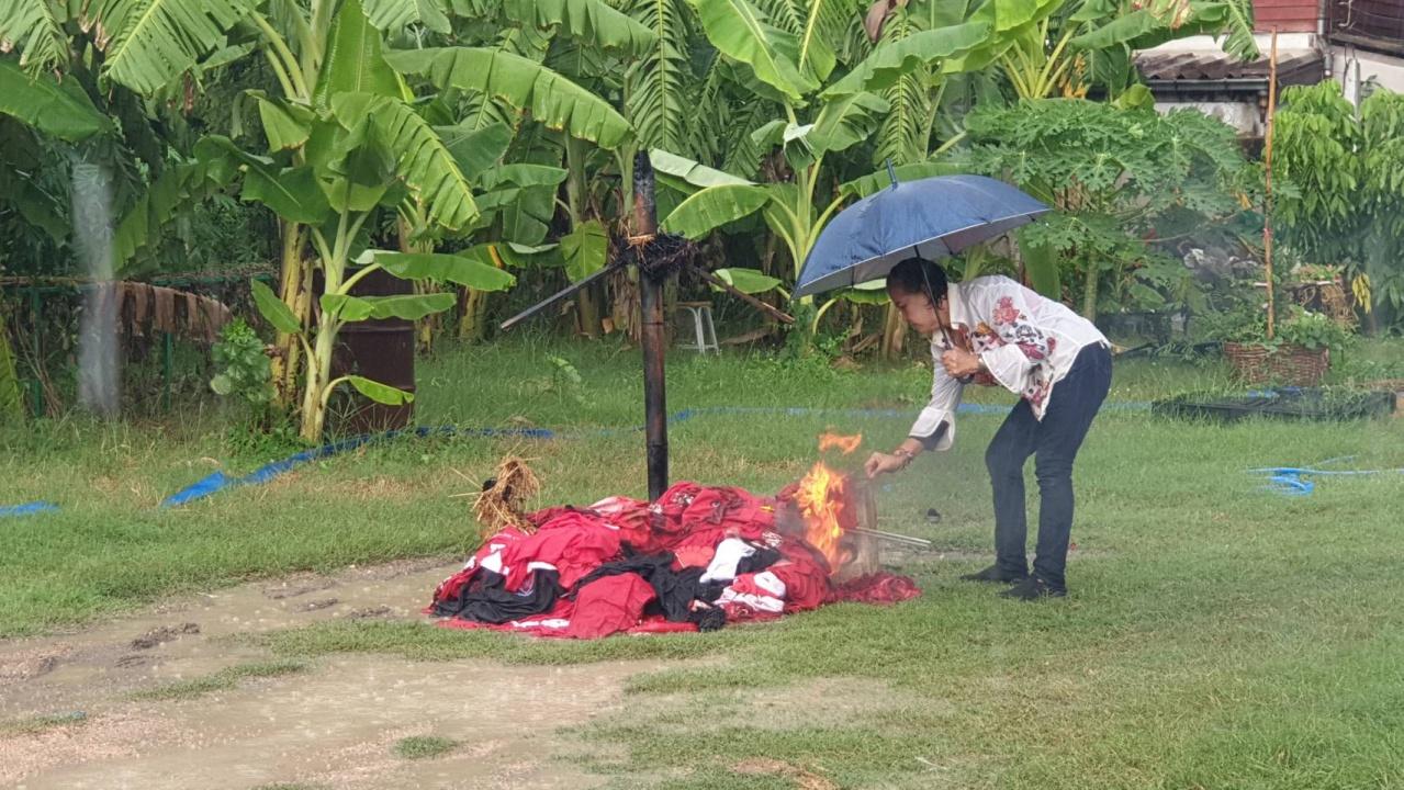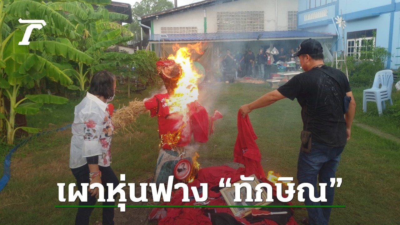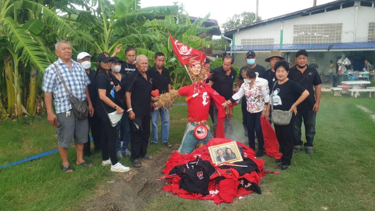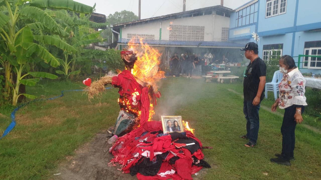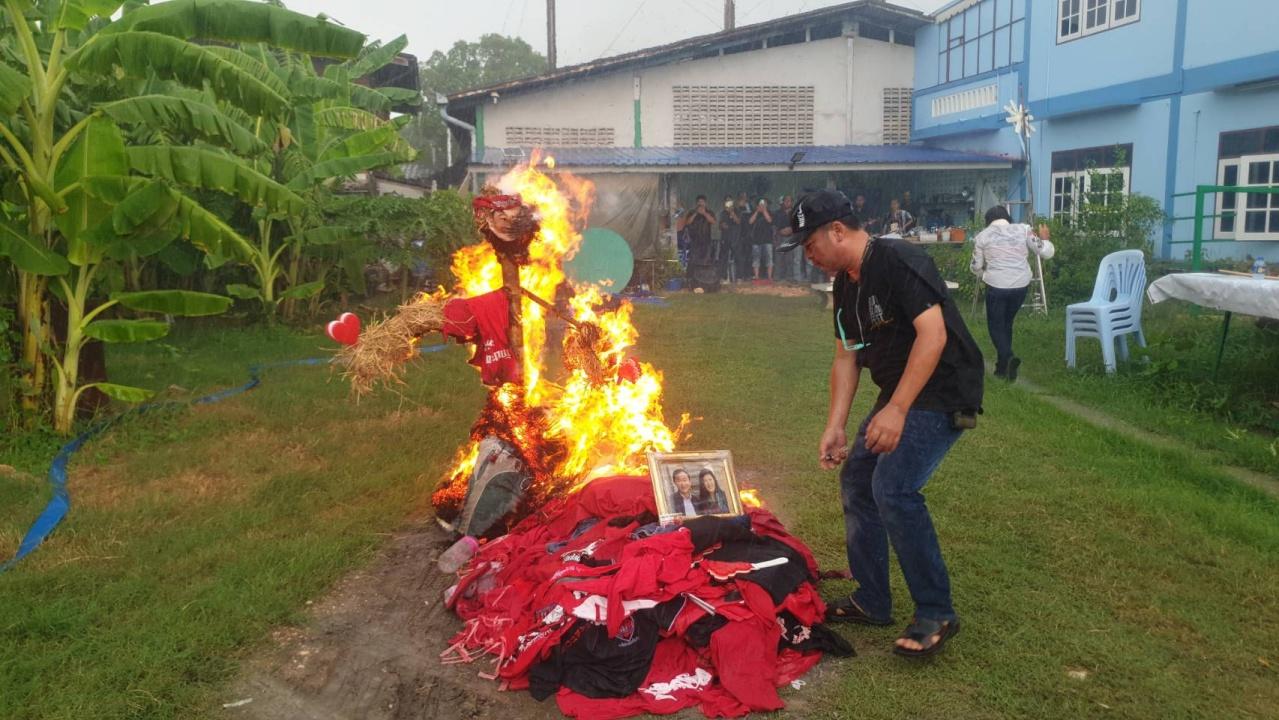 กลุ่มมวลชนคนรักประชาธิปไตยสมุทรสาคร นำสัญลักษณ์ตั้งแต่ยุคไทยรักไทย เพื่อไทย หุ่นฟางทักษิณ เผาทำลายทิ้ง ประกาศอุดมการณ์ที่มีให้พรรคเพื่อไทยสิ้นสุดลงแล้ว หลังตระบัดสัตย์ ยอมกลืนเลือด หลอกเอาคะแนนเสียง
