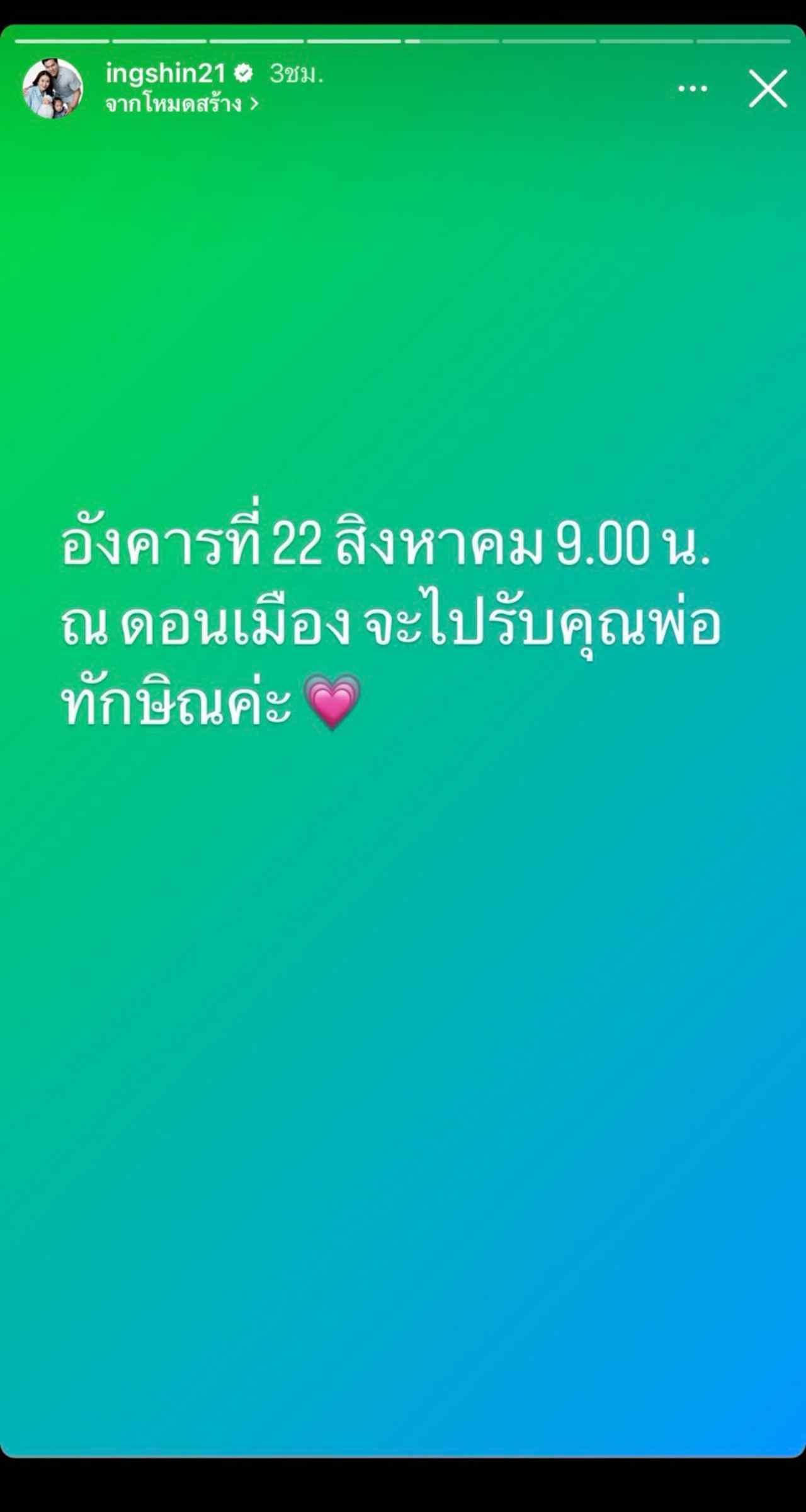 มาครั้งนี้ แพทองธาร โพสต์อีก จะไปรับ "คุณพ่อ" ที่ดอนเมือง 22 ส.ค. เวลา 09.00 น. ก็พอดีเป็นวันเดียวกับ สภานัดจะมีการโหวตนายกรัฐมนตรี โดยพรรคเพื่อไทย จะเสนอชื่อนายเศรษฐา ทวีสิน เสียอีก