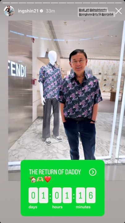 ล่าสุด น.ส.แพทองธาร ได้โพสต์ผ่านอินสตาแกรม สตอรี่ อีกครั้ง เป็นรูปของนายทักษิณ ชินวัตร อดีตนายกรัฐมนตรี และผู้เป็นบิดา พร้อมแท็กสมาชิกในครอบครัว ประกอบด้วย นางสาวพินทองทา ชินวัตร คุณากรวงศ์ พี่สาว และพี่เขย นายณัฐพงศ์ คุณากรวงศ์, นายพานทองแท้ ชินวัตร พี่ชาย และ พี่สะใภ้ น.ส.ณัฐฐิญา ปวงคำ รวมถึง นายปิฎก สุขสวัสดิ์ ผู้เป็นสามี พร้อมระบุว่า “The return of Daddy” แปลว่า “การกลับมาของพ่อ” พร้อมอีโมจิหัวใจและบ้าน และมีการตั้งเวลานับถอยหลังประกอบรูปด้วย