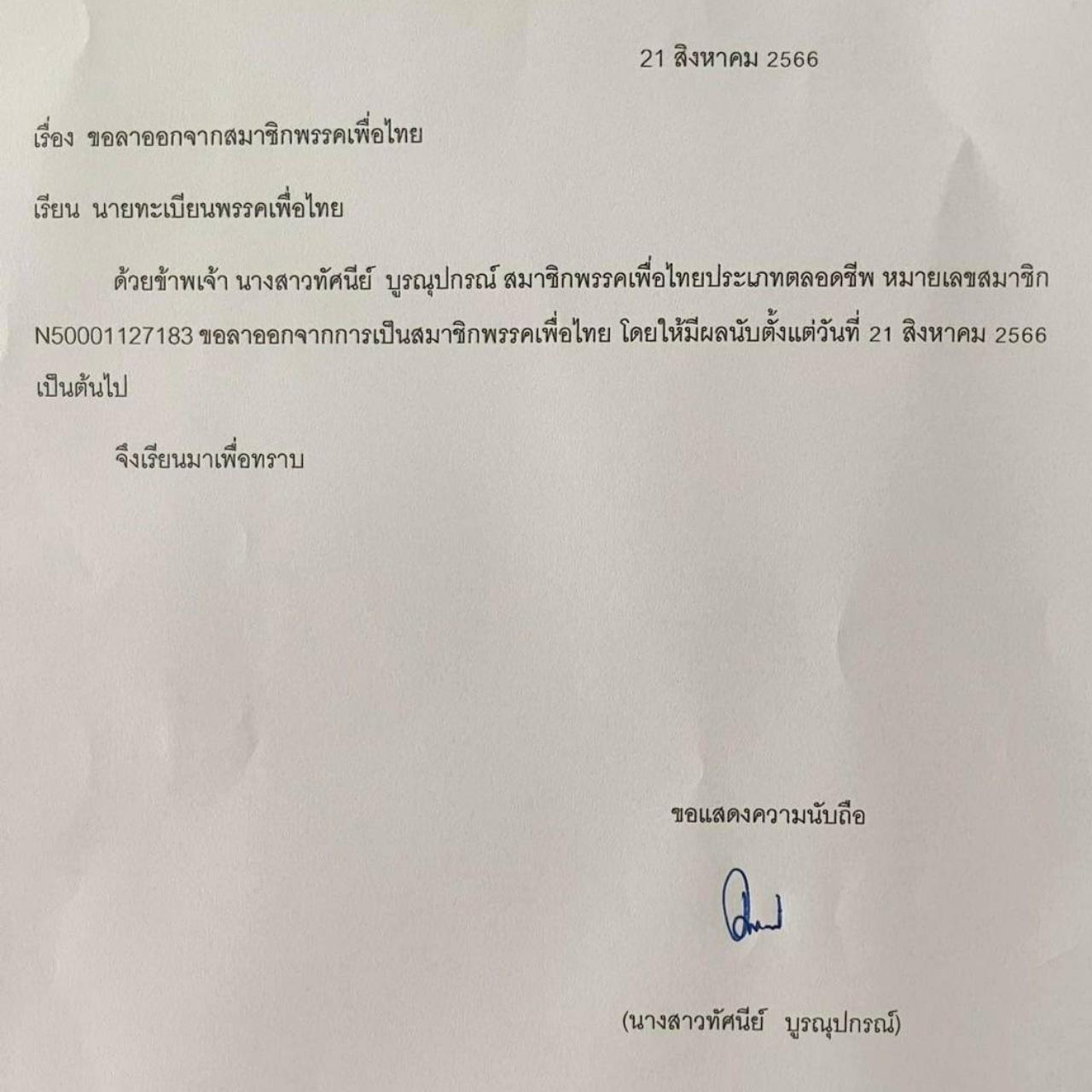 วันที่ 21 ส.ค. 66 หลังจากที่ นายณัฐวุฒิ ใสยเกื้อ ประกาศลาออกจากผู้อำนวยการครอบครัวเพื่อไทย ยุติบทบาทและการทำงานร่วมกับพรรคเพื่อไทย จากกรณีจับมือกับพรรคลุง ล่าสุดมีรายงานว่าวันเดียวกันนี้ นางสาวทัศนีย์ บูรณุปกรณ์ อดีตผู้สมัคร ส.ส.เขต 3 พรรคเพื่อไทย จ.เชียงใหม่ โพสต์ในเฟซบุ๊กส่วนตัวเป็นหนังสือลาออกจากการเป็นสมาชิกพรรคประเภทตลอดชีพ ให้มีผลตั้งแต่วันนี้เป็นต้นไป โดยนางสาวทัศนีย์ระบุว่า