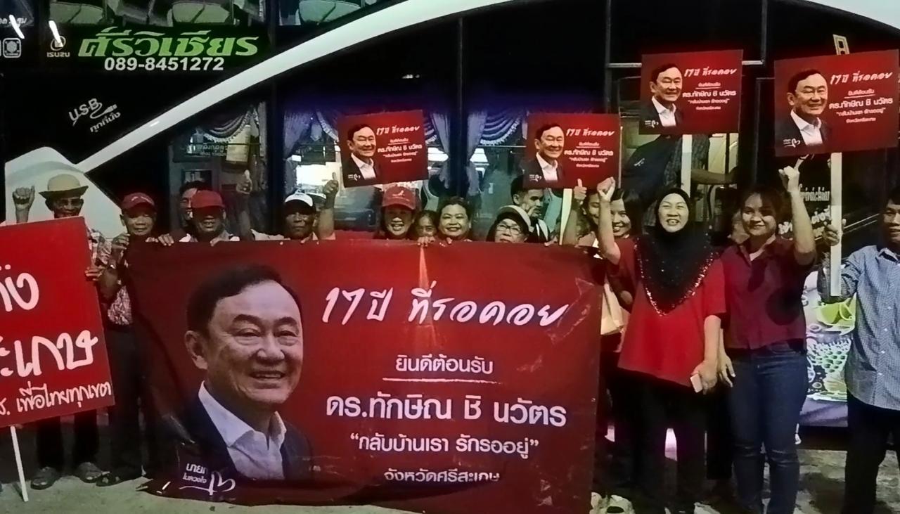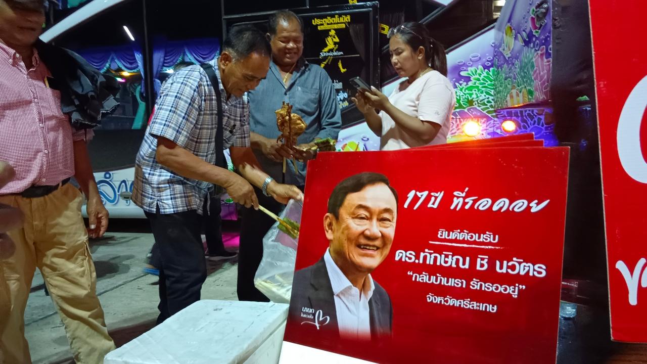 เกี่ยวกับเรื่องนี้ เมื่อเวลา 19.30 น. วันที่ 21 สิงหาคม 2566 ผู้สื่อข่าวรายงานว่า กลุ่มคนเสื้อแดง จ.ศรีสะเกษ นำโดย นางอัญชลี ทิพวงษา หรือแอ๊ว ศรีสะเกษ แกนนำคนเสื้อแดงศรีสะเกษ นำทีมคนเสื้อแดงจาก จ.ศรีสะเกษ ทั้ง 22 อำเภอ จำนวนประมาณ 300 คน โดยมีการเช่ารถทัวร์ 2 ชั้น พร้อมด้วยรถตู้ และรถยนต์ส่วนตัว พร้อมกับห่อข้าวห่อน้ำ มุ่งหน้าเข้ากรุงเทพมหานคร เพื่อที่จะไปเตรียมต้อนรับการเดินทางกลับบ้านเกิดของอดีตนายกฯ ทักษิณ ที่สนามบินดอนเมือง โดยมีจุดรับ-ส่งกลุ่มคนเสื้อแดง จำนวน 5 จุด ในพื้นที่ 5 อำเภอ ประกอบด้วย ที่ อ.กันทรลักษ์, อ.ราษีไศล, อ.ขุนหาญ, อ.ภูสิงห์ อ.เมืองศรีสะเกษ และอำเภอใกล้เคียง ซึ่งกลุ่มคนเสื้อแดงภาคอีสาน ได้นัดรวมพลกันที่ อ.วังน้อย จ.พระนครศรีอยุธยา ในเวลาประมาณ 04.00 น. ก่อนที่จะนำขบวนเคลื่อนไปยังสนามบินดอนเมืองในช่วงเช้า