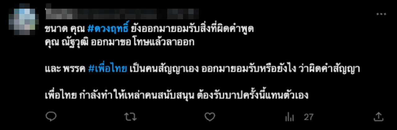 ขณะที่ ในโซเชียลได้มีการแสดงความคิดเห็นพร้อมติด แฮชแท็ก #ดวงฤทธิ์ เรียกร้องให้คนเพื่อไทย ที่เคยลั่นวาจาสัญญากับประชาชนไว้ ออกมารับผิดชอบต่อคำพูดของตัวเองแบบ นายดวงฤทธิ์.