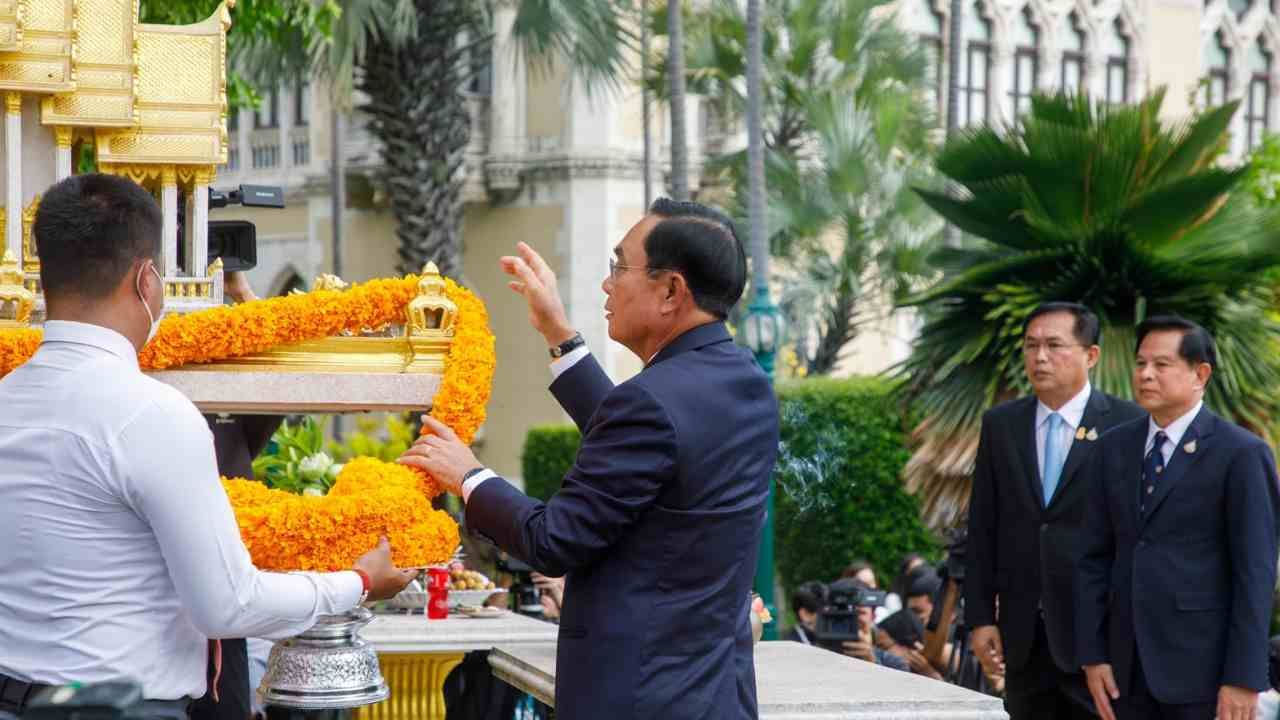 จากนั้นพล.อ.ประยุทธ์ ถือฤกษ์เวลา 09.09 น. สักการะสิ่งศักดิ์สิทธิ์ประจำทำเนียบฯ ศาลพระภูมิเจ้าที่ และศาลตา ศาลยาย โดยผู้สื่อข่าวสอบถามว่า อธิษฐานอะไรบ้าง พล.อ.ประยุทธ์ กล่าวว่า “ขอให้บ้านเมืองสงบ ร่มเย็นทุกคนมีความสุข”
