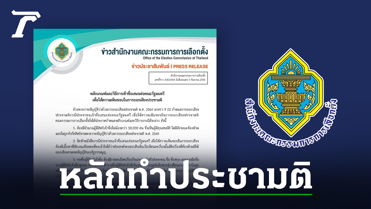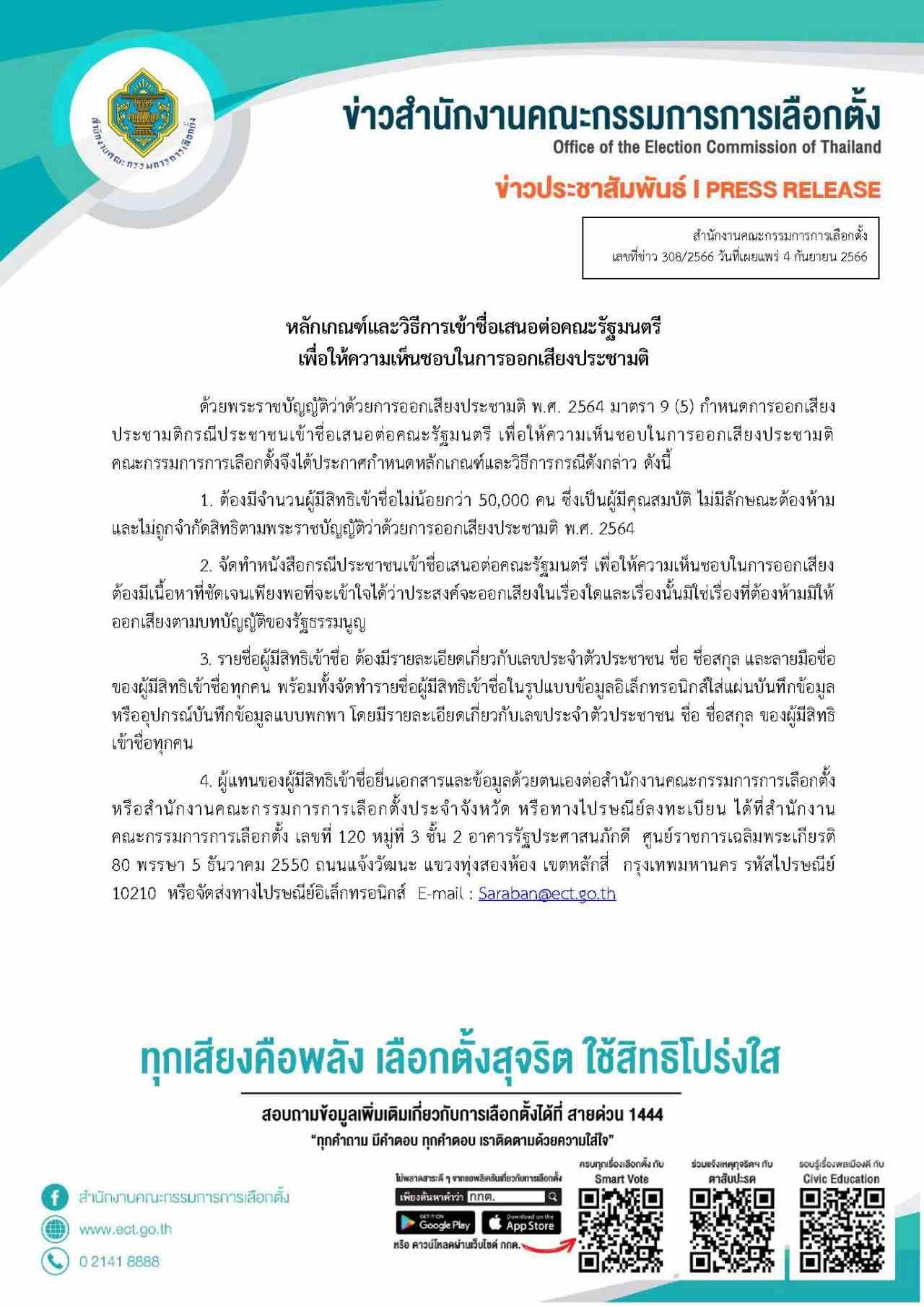 วันที่ 4 ก.ย. 2566 สํานักงานคณะกรรมการการเลือกตั้ง เผย หลักเกณฑ์และวิธีการเข้าชื่อเสนอต่อคณะรัฐมนตรี เพื่อให้ความเห็นชอบในการออกเสียงประชามติ ด้วยพระราชบัญญัติว่าด้วยการออกเสียงประชามติ พ.ศ. 2564 มาตรา 9 (5) กําหนดการออกเสียง ประชามติกรณีประชาชนเข้าชื่อเสนอต่อคณะรัฐมนตรี เพื่อให้ความเห็นชอบในการออกเสียงประชามติ คณะกรรมการการเลือกตั้งจึงได้ประกาศกําหนดหลักเกณฑ์และวิธีการกรณีดังกล่าว ดังนี้