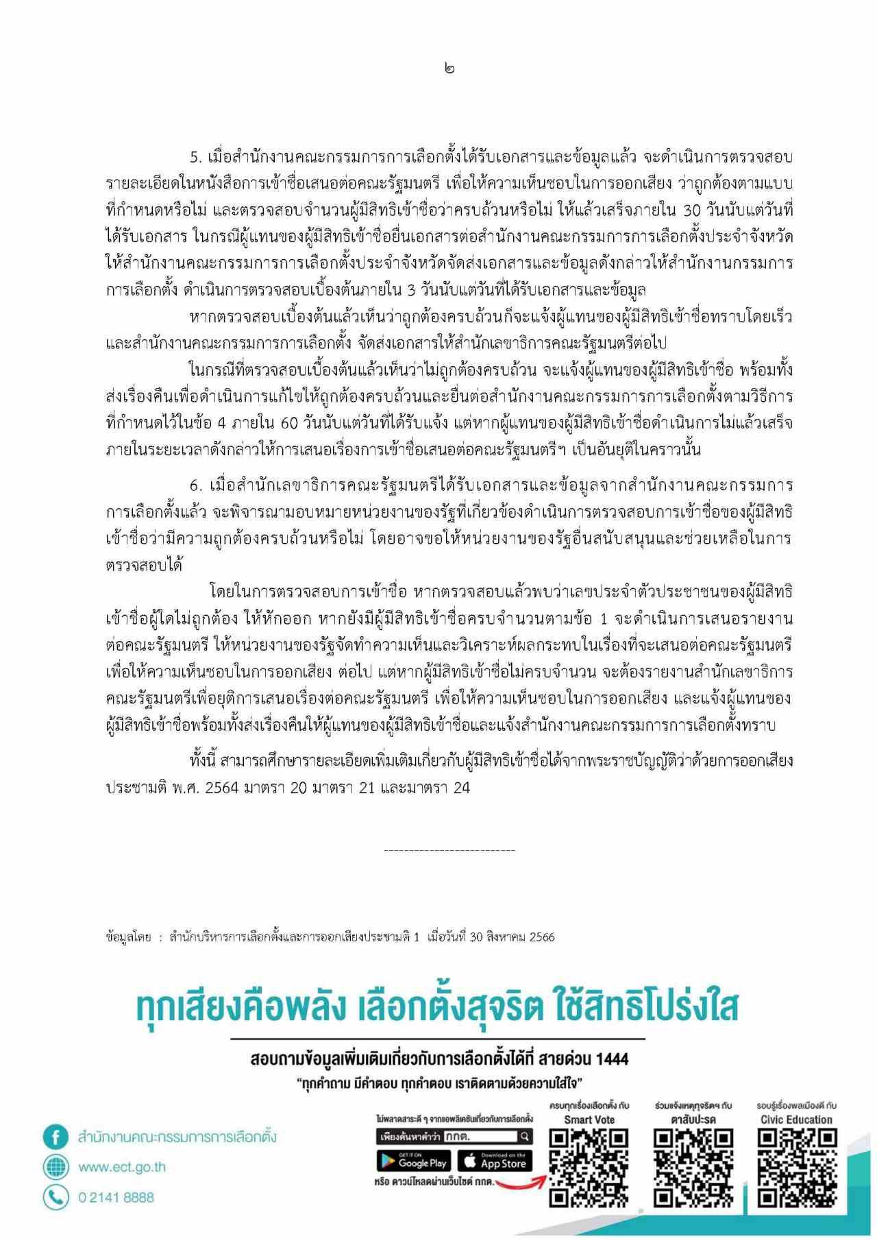 5. เมื่อสํานักงานคณะกรรมการการเลือกตั้งได้รับเอกสารและข้อมูลแล้ว จะดําเนินการตรวจสอบ รายละเอียดในหนังสือการเข้าชื่อเสนอต่อคณะรัฐมนตรี เพื่อให้ความเห็นชอบในการออกเสียง ว่าถูกต้องตามแบบ ที่กําหนดหรือไม่ และตรวจสอบจํานวนผู้มีสิทธิเข้าชื่อว่าครบถ้วนหรือไม่ ให้แล้วเสร็จภายใน 30 วันนับแต่วันที่ ได้รับเอกสาร ในกรณีผู้แทนของผู้มีสิทธิเข้าชื่อยื่นเอกสารต่อสํานักงานคณะกรรมการการเลือกตั้งประจําจังหวัด ให้สํานักงานคณะกรรมการการเลือกตั้งประจําจังหวัดจัดส่งเอกสารและข้อมูลดังกล่าวให้สํานักงานกรรมการ การเลือกตั้ง ดําเนินการตรวจสอบเบื้องต้นภายใน 3 วันนับแต่วันที่ได้รับเอกสารและข้อมูล หากตรวจสอบเบื้องต้นแล้วเห็นว่าถูกต้องครบถ้วนก็จะแจ้งผู้แทนของผู้มีสิทธิเข้าชื่อทราบโดยเร็ว และสํานักงานคณะกรรมการการเลือกตั้ง จัดส่งเอกสารให้สํานักเลขาธิการคณะรัฐมนตรีต่อไป