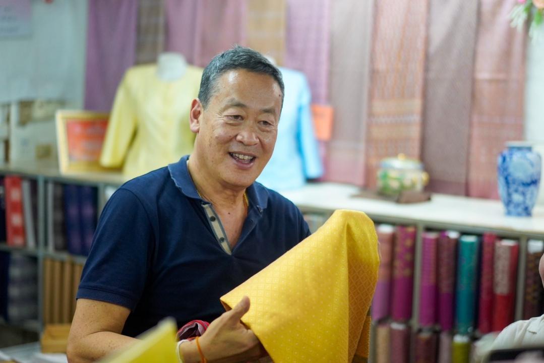 จากนั้นนายกรัฐมนตรีได้เดินชมสินค้าพร้อมบอกว่า ประชุมคณะรัฐมนตรีนัดแรกจะต้องใส่ผ้าไทย ซึ่งได้เตรียมตัดไว้แล้ว แต่มาวันนี้ก็อยากจะมาเลือกผ้าเพื่อไปตัดเพิ่ม โดยนายกรัฐมนตรีได้เลือกซื้อผ้าทอสีเหลือง ยกดอกสุรินทร์ 1 ผืน ในราคา 8,500 บาท