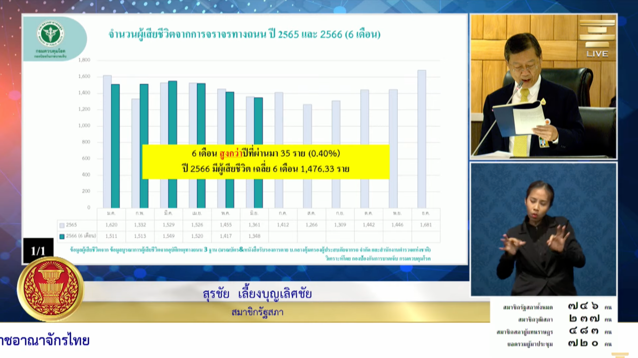 ทั้งนี้ เมื่อกำหนดเป็นนโยบายแล้ว แม้เป็นประโยคสั้นๆ อยากให้รับทราบว่า การเสียชีวิตบนท้องถนน ณ ขณะนี้ยังสูงอยู่ ตั้งแต่ปี 2554-2566 (3 เดือนแรก) มีผู้เสียชีวิตไปแล้ว 2.4 แสนคน ซึ่งเป็นปัญหาสำคัญของประเทศที่ขาดการเอาใจใส่ดูแล อีกทั้งไม่ได้เกิดแต่กับคนไทย เพราะในปี 2565 มีนักท่องเที่ยว 7,026 คนเสียชีวิตในไทย จึงขอฝากกระทรวงที่เกี่ยวข้องช่วยกันแก้ปัญหาเรื่องนี้
