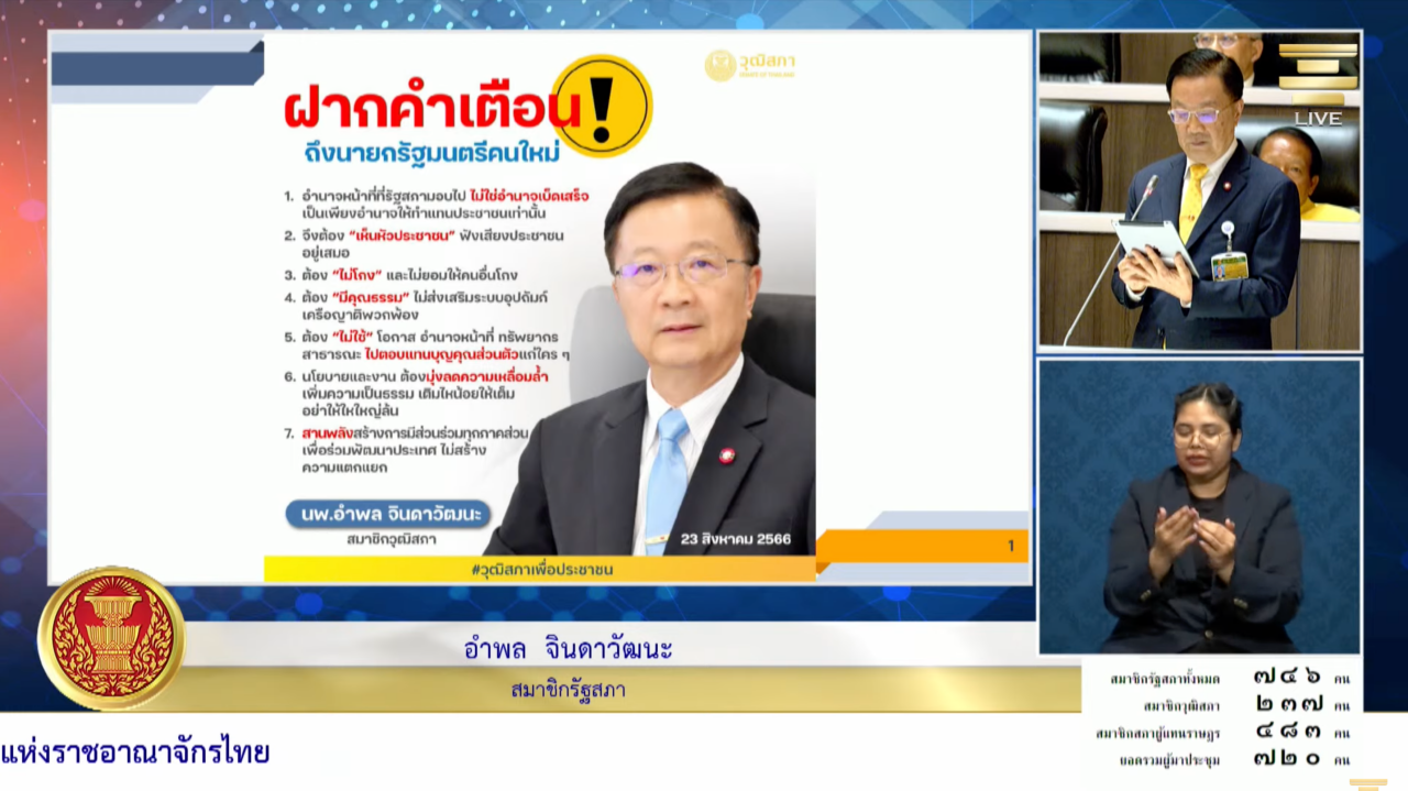 พร้อมฝากเตือนถึงนายกรัฐมนตรีใหม่ ว่า อำนาจหน้าที่ที่รัฐสภามอบให้ ไม่ใช่อำนาจเบ็ดเสร็จ เป็นเพียงอำนาจที่ให้ทำแทนประชาชนเท่านั้น จึงต้องเห็นหัวประชาชน ฟังเสียงประชาชนอยู่เสมอ อีกทั้งต้องไม่โกงและไม่ยอมให้คนอื่นโกง ต้องมีคุณธรรม ไม่ส่งเสริมระบบอุปถัมภ์เครือญาติพวกพ้อง ต้องไม่ใช้โอกาสและอำนาจหน้าที่ไปตอบแทนบุญคุณส่วนตัวแก่ใคร นโยบายต้องมุ่งลดความเหลื่อมล้ำ เพิ่มความเป็นธรรม อละสานพลังการมีส่วนร่วมของทุกภาคส่วนเพื่อพัฒนาประเทศ ไม่สร้างความแตกแยก
