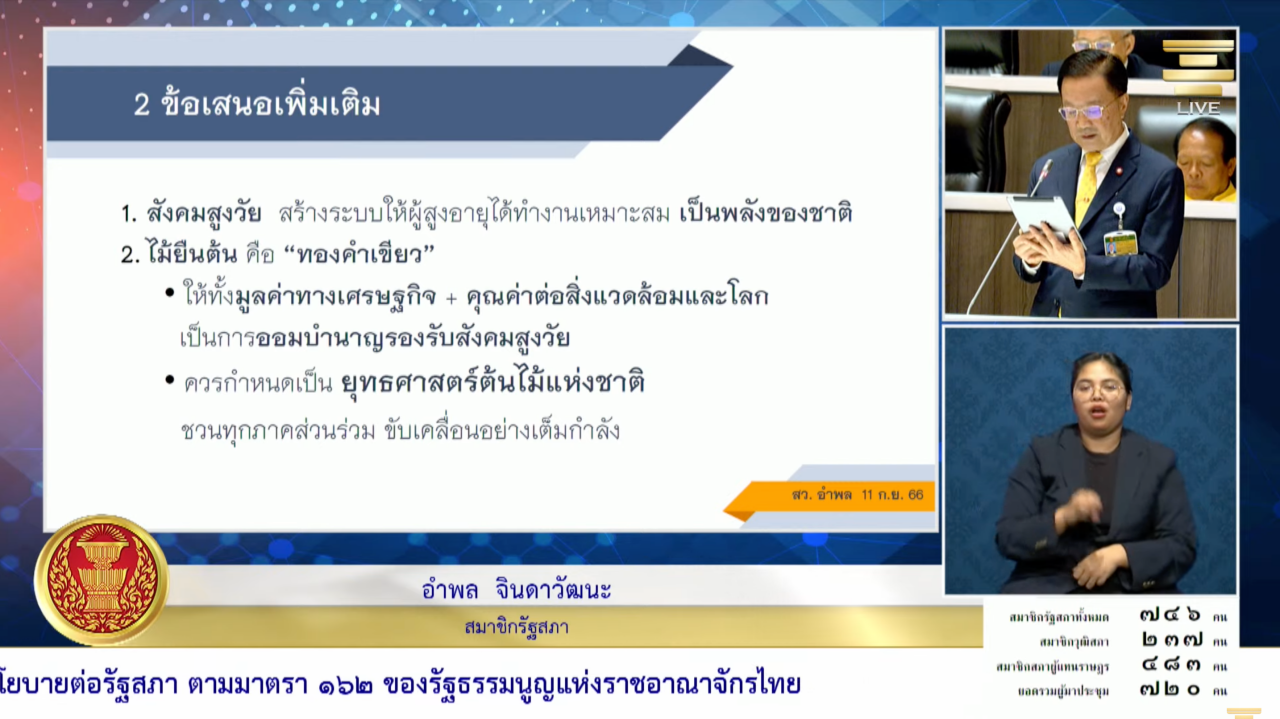 ขณะเดียวกันขอฝาก 2 ประเด็น คือ สังคมสูงวัย ต้องสร้างระบบให้ผู้สูงอายุได้ทำงานเหมาะสม ได้ทำงานต่อ 10-20 ปี ต้องพัฒนาระบบ มีค่าตอบแทนที่เหมาะสม ไม่ใช่ปล่อยให้คนอายุ 60 ปีที่ยังมีศักยภาพ นั่งกินนอนกินไม่มีงานทำ ขณะที่ผู้สูงอายุอาชีพอื่นๆ ก็ต้องมีการเข้าไปพัฒนาเฉพาะกลุ่ม พร้อมกันนี้ขอสนับสนุนในเรื่องไม้ยืนต้นซึ่งมีมีมูลค่ามาก ให้มูลค่าเศรษฐกิจในระยะกลางและระยะยาว ขอฝากนายกรัฐมนตรีและคณะรัฐมนตรี (ครม.) กำหนดยุทธศาสตร์ต้นไม้แห่งชาติ สร้างการมีส่วนร่วมปลูกต้นไม้