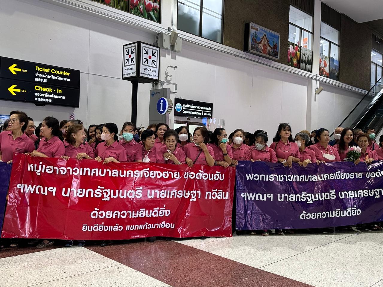 ทั้งนี้ เมื่อมาถึงได้มี นายพิเชษฐ์ เชื้อเมืองพาน รองประธานสภาผู้แทนราษฎร คนที่ 2 และ สส.เชียงราย พรรคเพื่อไทย มาต้อนรับ พร้อมกลุ่มเครือข่ายสตรีเทศบาลนครเชียงราย นำพวงมาลัยดอกดาวเรือง ดอกกุหลาบสีแดงและสีชมพู มามอบให้นายกรัฐมนตรี พร้อมถือป้ายข้อความ “หมู่เฮาจาวเทศบาลนครเจียงฮาย ขอต้อนฮับ ฯพณฯ นายกรัฐมนตรี นายเศรษฐา ทวีสิน ด้วยความยินดียิ่ง ยินดียิ่งแล้ว แขกแก้วมาเยือน” ขณะที่นายกรัฐมนตรีกล่าวขอบคุณที่มาต้อนรับ รวมถึงบางส่วนก็มีการถ่ายภาพทะเบียนรถนายกรัฐมนตรีที่ใช้ลงพื้นที่ก่อนที่สลากกินแบ่งรัฐบาลจะประกาศรางวัลงวดประจำวันที่ 16 กันยายน 2566 ด้วย