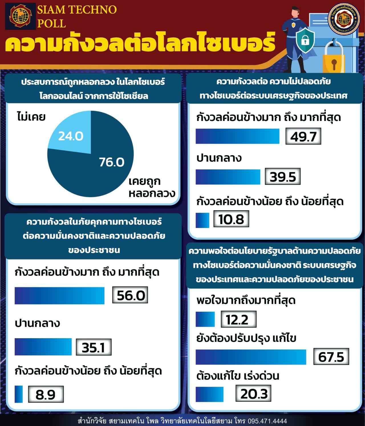 โพล ชี้ คนไทยกังวลภัยไซเบอร์ระบาด ขอรัฐเร่งแก้ความไม่ปลอดภัย ออกกฎหมายครอบคลุมทุกมิติ ส่วนใหญ่ 76% เคยถูกหลอกลวง น่าห่วง ยังไม่พบไทยมีมาตรฐานกลาง เกิดจากความร่วมมือหน่วยงานรัฐและภาคเอกชน