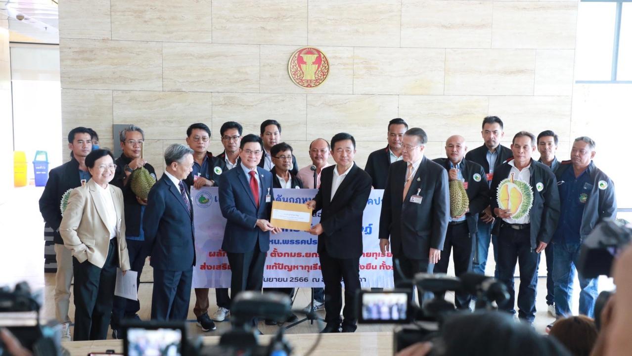 วันที่ 28 ก.ย. 2566 ที่อาคารรัฐสภา นายจุรินทร์ ลักษณวิศิษฏ์ รักษาการหัวหน้าพรรคประชาธิปัตย์ พร้อมด้วย นายชวน หลีกภัย นายบัญญัติ บรรทัดฐาน สส.แบบบัญชีรายชื่อ พรรคประชาธิปัตย์ รับข้อร้องเรียนจากเครือข่ายผู้ปลูกทุเรียน ตัวแทนเกษตรกรผู้ปลูกทุเรียน ในเขตอำเภอแกลง อำเภอเขาชะเมา อำเภอวังจันทร์ จังหวัดระยอง นำโดย นายแพทย์บัญญัติ เจตนจันทร์ อดีต สส.จังหวัดระยอง พรรคประชาธิปัตย์ เพื่อผลักดันให้สภาผู้แทนราษฎร ตั้งคณะกรรมาธิการวิสามัญเพื่อพิจารณาศึกษาการส่งเสริมพัฒนา แก้ปัญหาทุเรียนให้ครบวงจรอย่างยั่งยืนและเป็นระบบ พร้อมกับยกร่างกฎหมายเกี่ยวกับทุเรียน