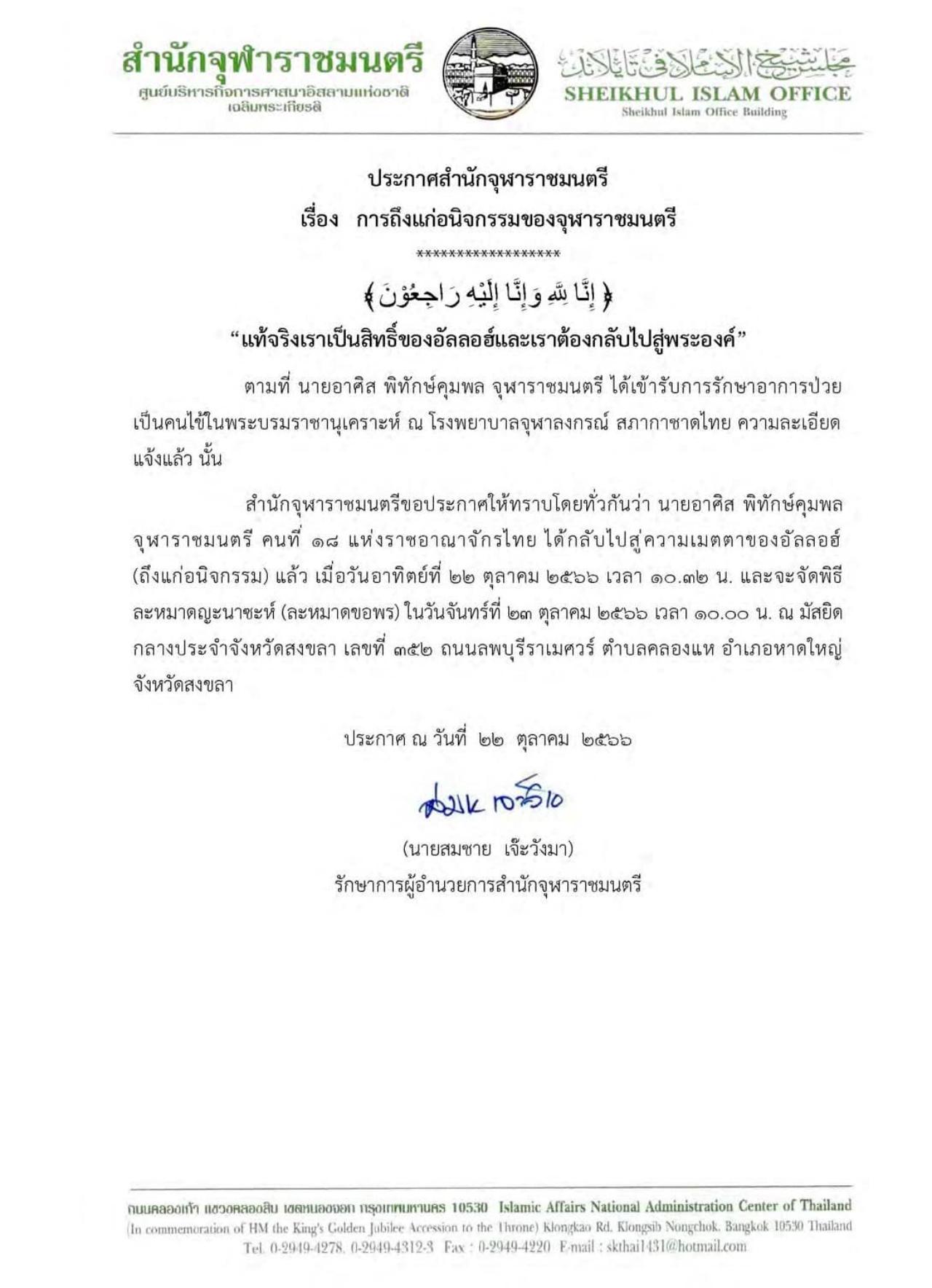 สำนักจุฬาราชมนตรีขอประกาศให้ทราบโดยทั่วกันว่า นายอาศิส พิทักษ์คุมพล จุฬาราชมนตรี คนที่ 18 แห่งราชอาณาจักรไทย ได้กลับสู่ความเมตตาของอัลลอฮ์ (ถึงแก่อนิจกรรม) เมื่อวันอาทิตย์ที่ 22 ตุลาคม 2566 เวลา 10.32 น. และจะจัดพิธีละหมาดญะนาซะห์ (ละหมาดขอพร) ในวันจันทร์ที่ 23 ตุลาคม 2566 เวลา 10.00 น. ณ มัสยิดกลางประจำจังหวัดสงขลา เลขที่ 352 ถนนลพบุรีราเมศวร์ ตำบลคลองแห อำเภอหาดใหญ่ จังหวัดสงขลา.