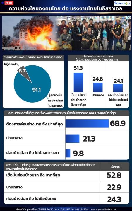 ผลสำรวจซูเปอร์โพล เผย คนไทยส่วนใหญ่ ห่วงใยแรงงานไทยในอิสราเอล ชี้เป็นฟันเฟืองเคลื่อนเศรษฐกิจชาติ ขอรัฐบาลเร่งอพยพกลับประเทศ พร้อมเร่งเยียวยา จัดหางานเป็นกรณีพิเศษ