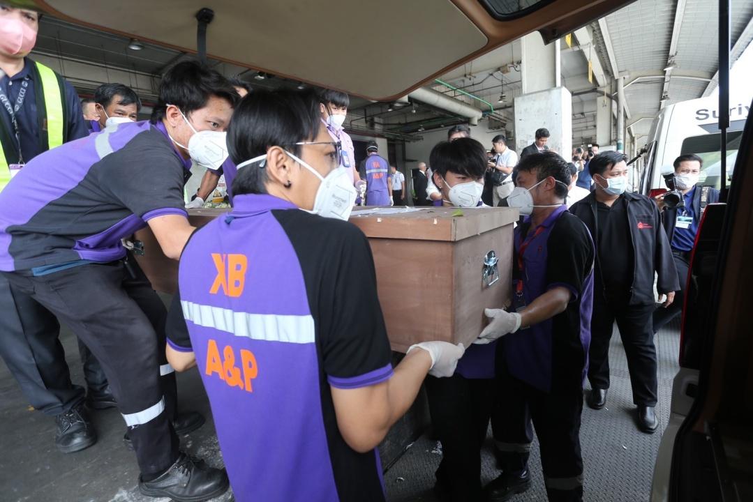 สำหรับการรับศพแรงงานไทยที่สนามบิน จะไม่มีการแกะกล่องบรรจุศพ แต่การขนย้ายจะดูจากเลขที่ใบขนย้าย และชื่อของผู้เสียชีวิต ติดอยู่ที่หน้ากล่อง ก่อนส่งกลับไปยังภูมิลำเนา โดยมีเจ้าหน้าที่ของทีมสุริยา ฟิวเนอรัล จำกัด นำรถตู้ 7 คัน มาจอดรอ เพื่อลำเลียงศพ ไปส่งให้กับครอบครัว เพื่อนำไปประกอบพิธีทางศาสนาทั้ง 5 จังหวัด คือที่หนองคาย เชียงราย กำแพงเพชร และขอนแก่น จังหวัดละ 1 ศพ ส่วนอุดรธานี มี 3 ศพ ที่ต้องส่งกลับ