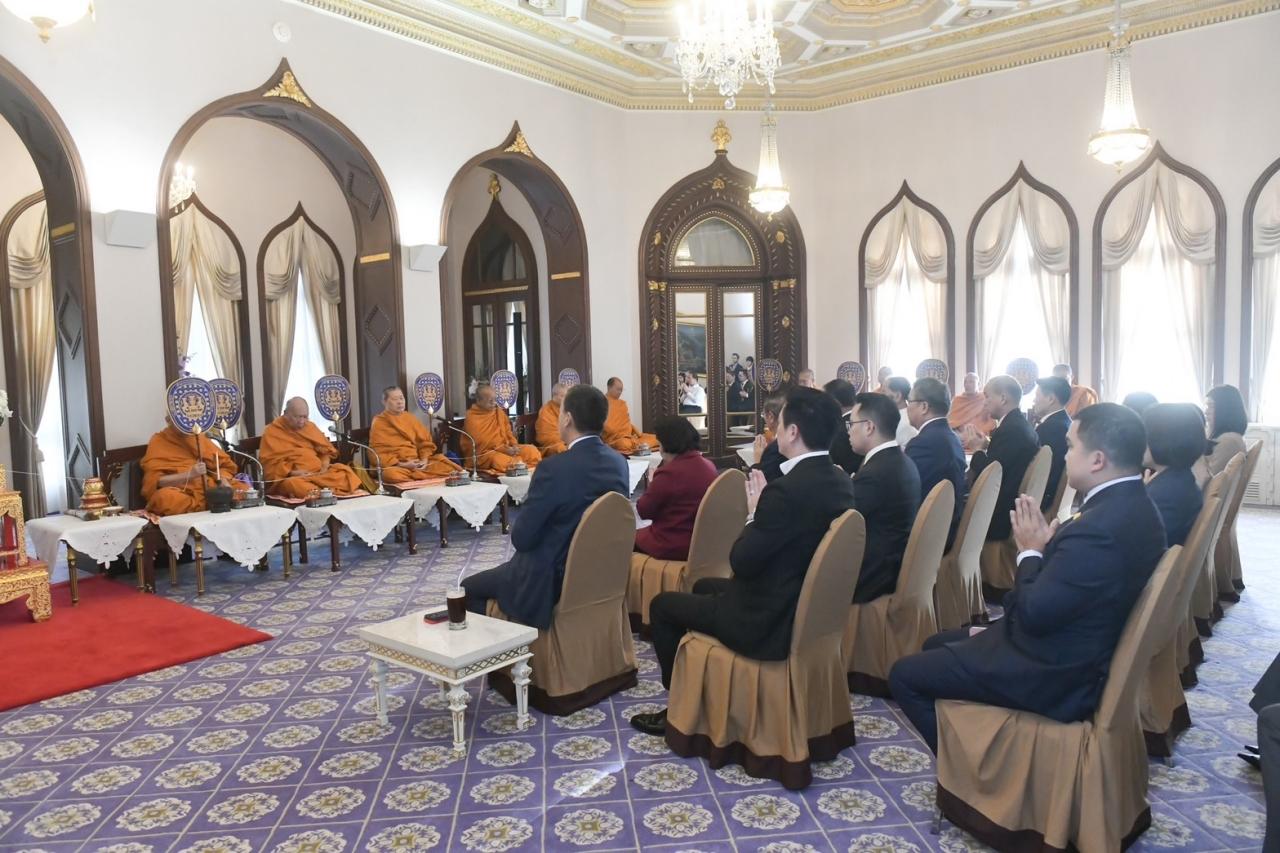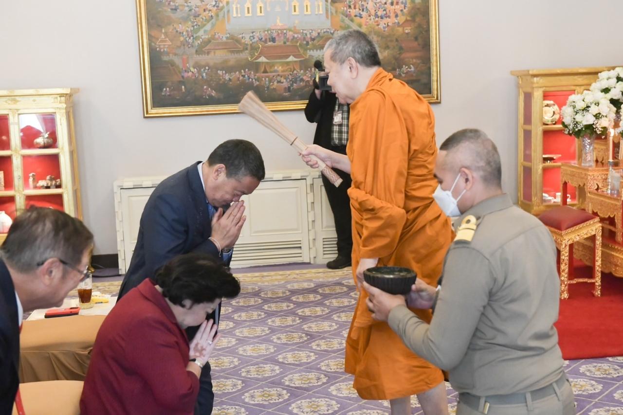ทั้งนี้ สมเด็จพระมหารัชมงคลมุนี ได้ประพรมน้ำมนต์ให้นายกรัฐมนตรี ผู้ร่วมงาน และห้องต่างๆ ในตึกไทยคู่ฟ้า รวมถึงห้องทำงาน และห้องนอนนายกรัฐมนตรี จากนั้นเวลา 08.07 น. เมื่อเสร็จสิ้นพิธี นายกรัฐมนตรีได้เดินลงมาส่งพระสงฆ์ โดยได้สนทนาธรรมกับสมเด็จพระมหารัชมงคลมุนี และสมเด็จพระมหาธีราจารย์