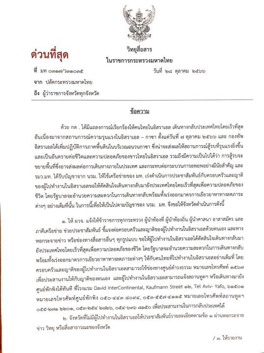 ปลัดกระทรวงมหาดไทย ส่งหนังสือเวียน ด่วนที่สุด รับลูก นายกฯ-มท.1 สั่งการให้ผู้ว่าฯ ทุกจังหวัด เร่งชี้แจงครอบครัวคนไทยในอิสราเอล ให้รีบเดินทางกลับประเทศ หลังการสู้รบเริ่มรุนแรงยิ่งขึ้นแล้ว