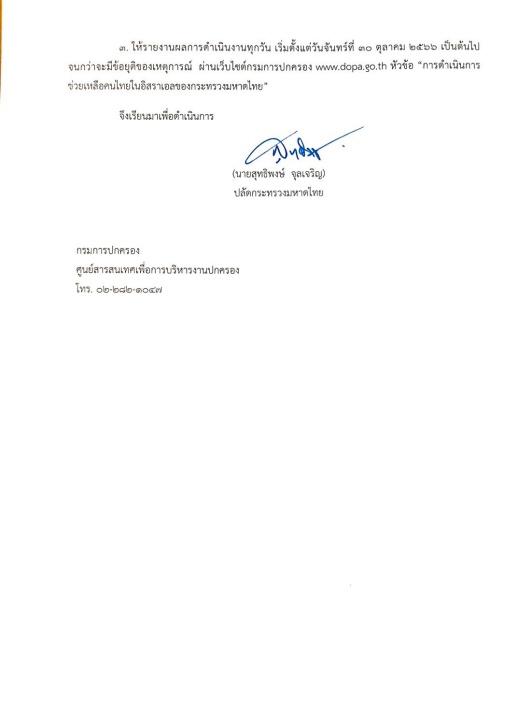 จนกว่าจะมีข้อยุติของเหตุการณ์ ผ่านเว็บไซต์กรมการปกครอง www.dopa.go.th หัวข้อ “การดำเนินการช่วยเหลือคนไทยในอิสราเอลของกระทรวงมหาดไทย”