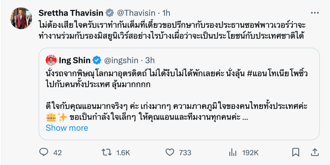 เมื่อเวลา 13.28 น.วันที่ 19 พ.ย.ผู้สื่อข่าวรายงานว่า นายเศรษฐา ทวีสิน นายกรัฐมนตรี และรมว.คลัง ได้รีทวีตข้อความของ น.ส.แพทองธาร ชินวัตร หัวหน้าพรรคเพื่อไทย ในฐานะรองประธานคณะกรรมการซอฟต์พาวเวอร์แห่งชาติ ที่โพสต์ข้อความผ่าน X โดยนายกฯระบุว่า ไม่ต้องเสียใจครับเราทำกันเต็มที่ เดี๋ยวขอปรึกษากับรองประธานซอฟต์พาวเวอร์ว่าจะทำงานร่วมกับรองมิสยูนิเวิร์สอย่างไรบ้างเผื่อว่าจะเป็นประโยชน์กับประเทศชาติได้