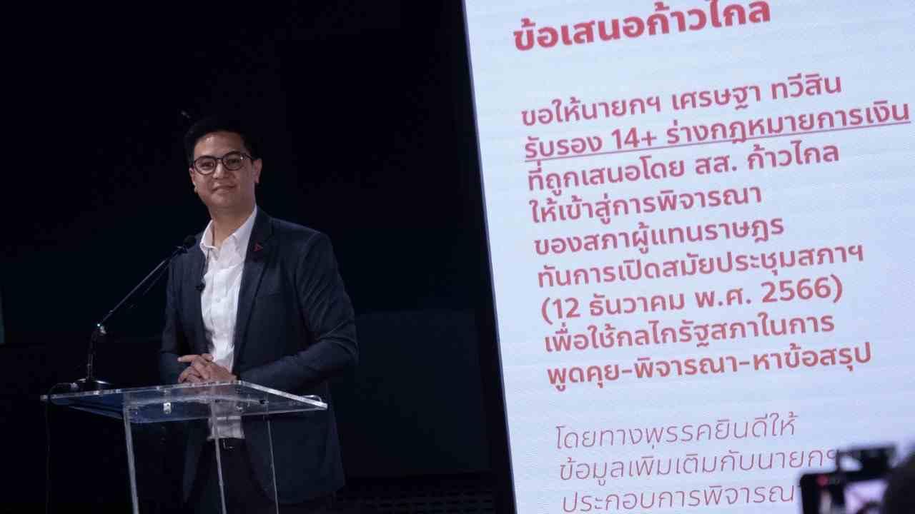 นายพริษฐ์ กล่าวว่า ตนและพรรคก้าวไกล จึงขอให้นายกฯ เศรษฐา พิจารณาให้คำรับรองกว่า 14 ร่างกฎหมายการเงิน ที่ถูกเสนอโดย สส. ก้าวไกลให้เข้าสู่การพิจารณาของสภาผู้แทนฯ ทันการเปิดสมัยประชุมสภา ในวันที่ 12 ธ.ค. 2566