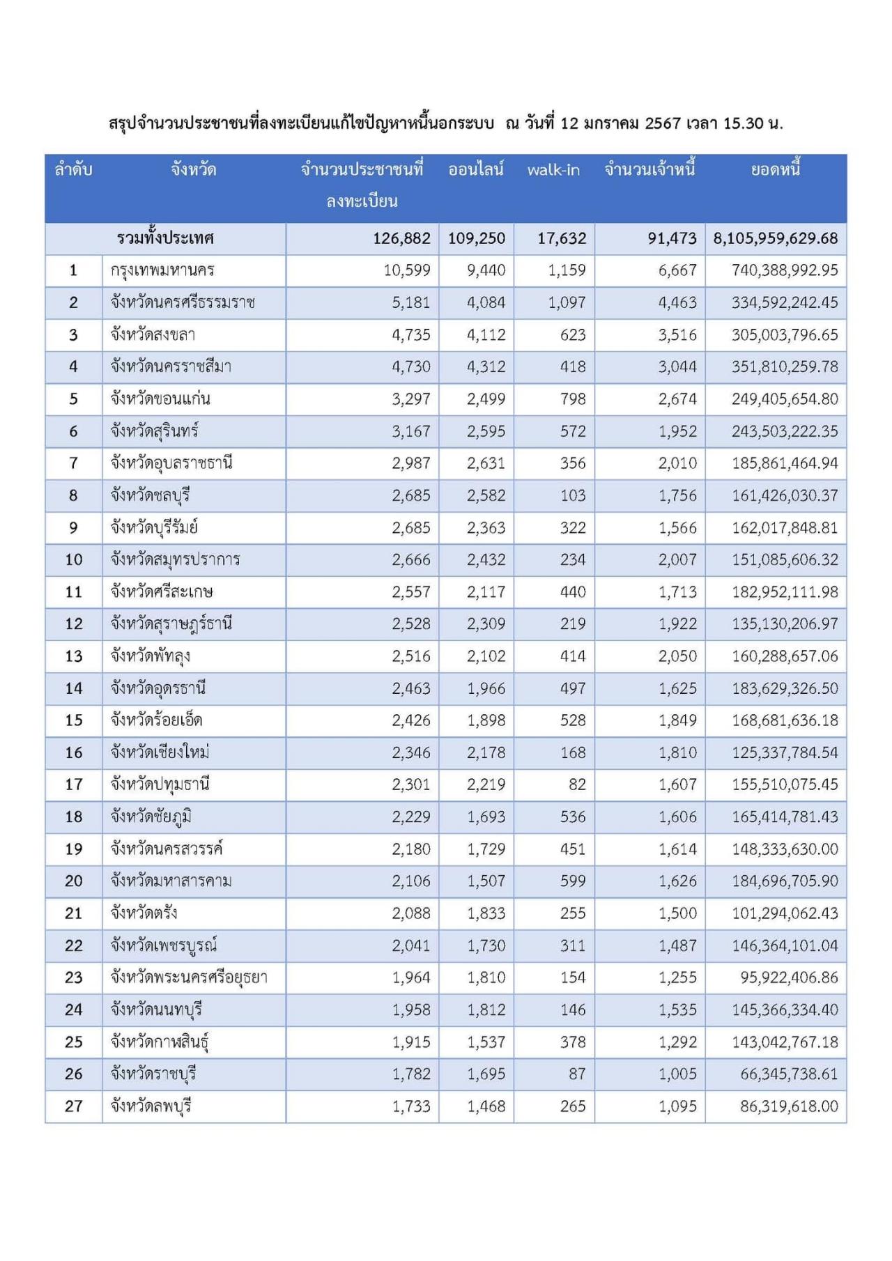 2. จังหวัดนครศรีธรรมราช มีผู้ลงทะเบียน 5,181 ราย เจ้าหนี้ 4,463 ราย มูลหนี้ 334.592 ล้านบาท