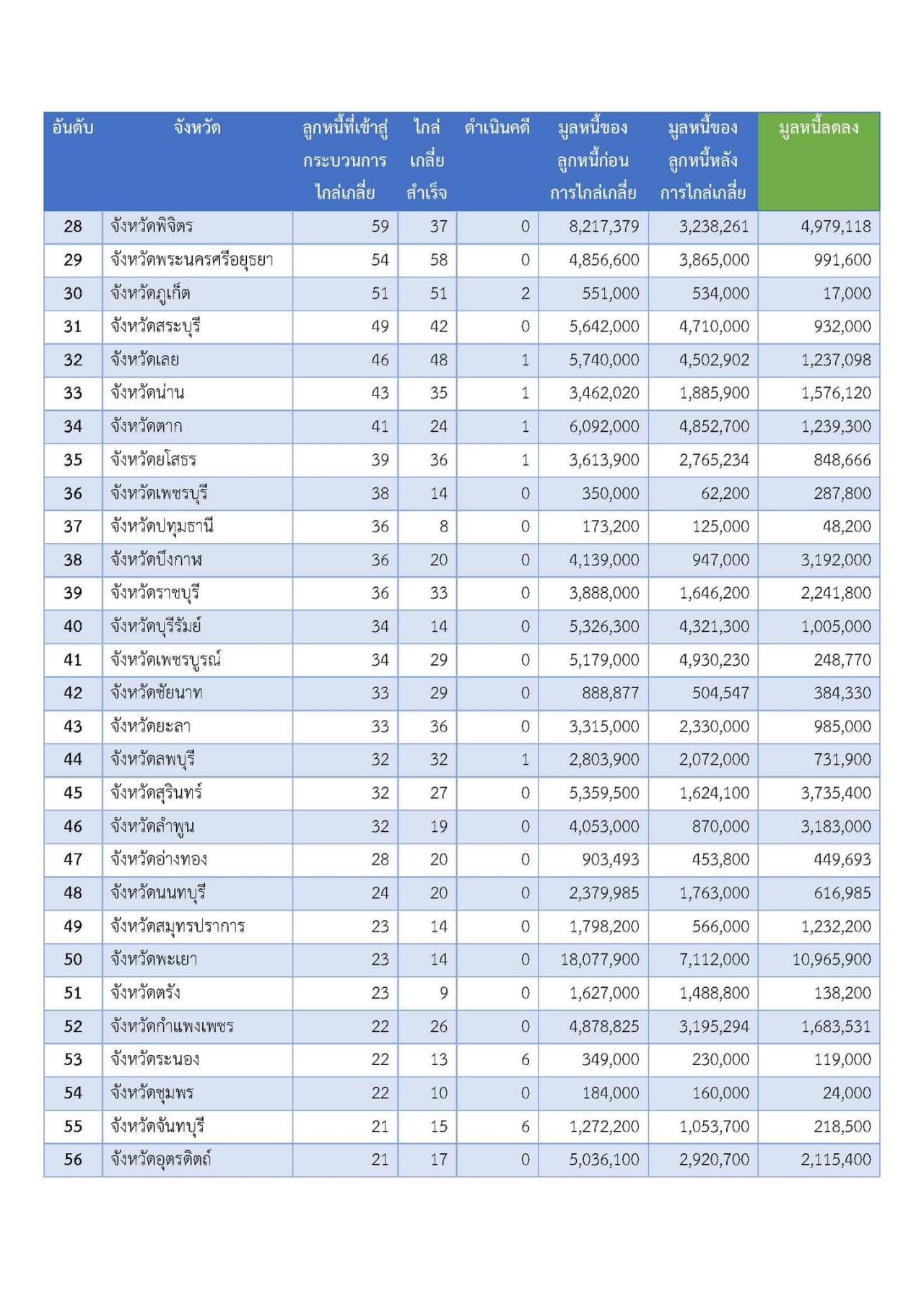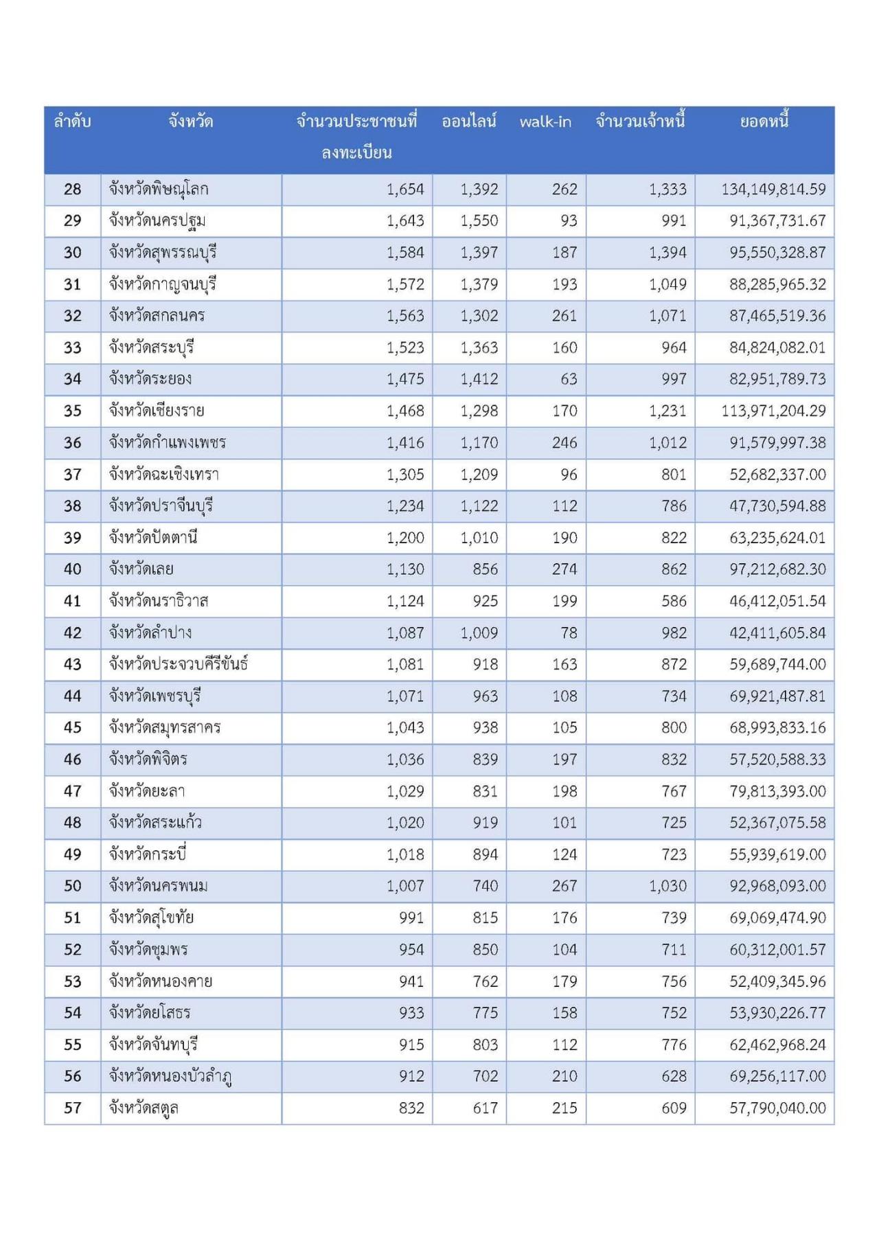 1. กรุงเทพมหานคร ยังคงมากที่สุด มีผู้ลงทะเบียน 10,599 ราย เจ้าหนี้ 6,667 ราย มูลหนี้ 740.388 ล้านบาท