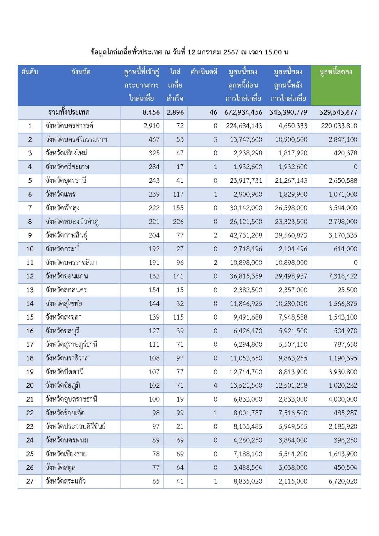 สำหรับข้อมูลการไกล่เกลี่ยหนี้นอกระบบทั่วประเทศ พบว่ามีลูกหนี้เข้าสู่กระบวนการไกล่เกลี่ยแล้ว 8,456 ราย ไกล่เกลี่ยสำเร็จ 2,896 ราย มูลหนี้ของลูกหนี้ก่อนไกล่เกลี่ย 672.934 ล้านบาท หลังการไกล่เกลี่ย 343.390 ล้านบาท มูลหนี้ลดลง 329.543 ล้านบาท