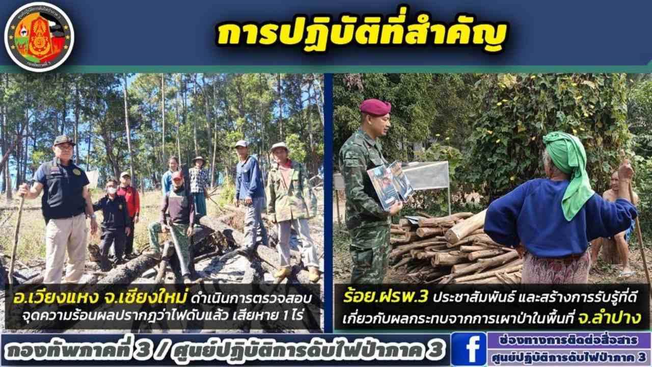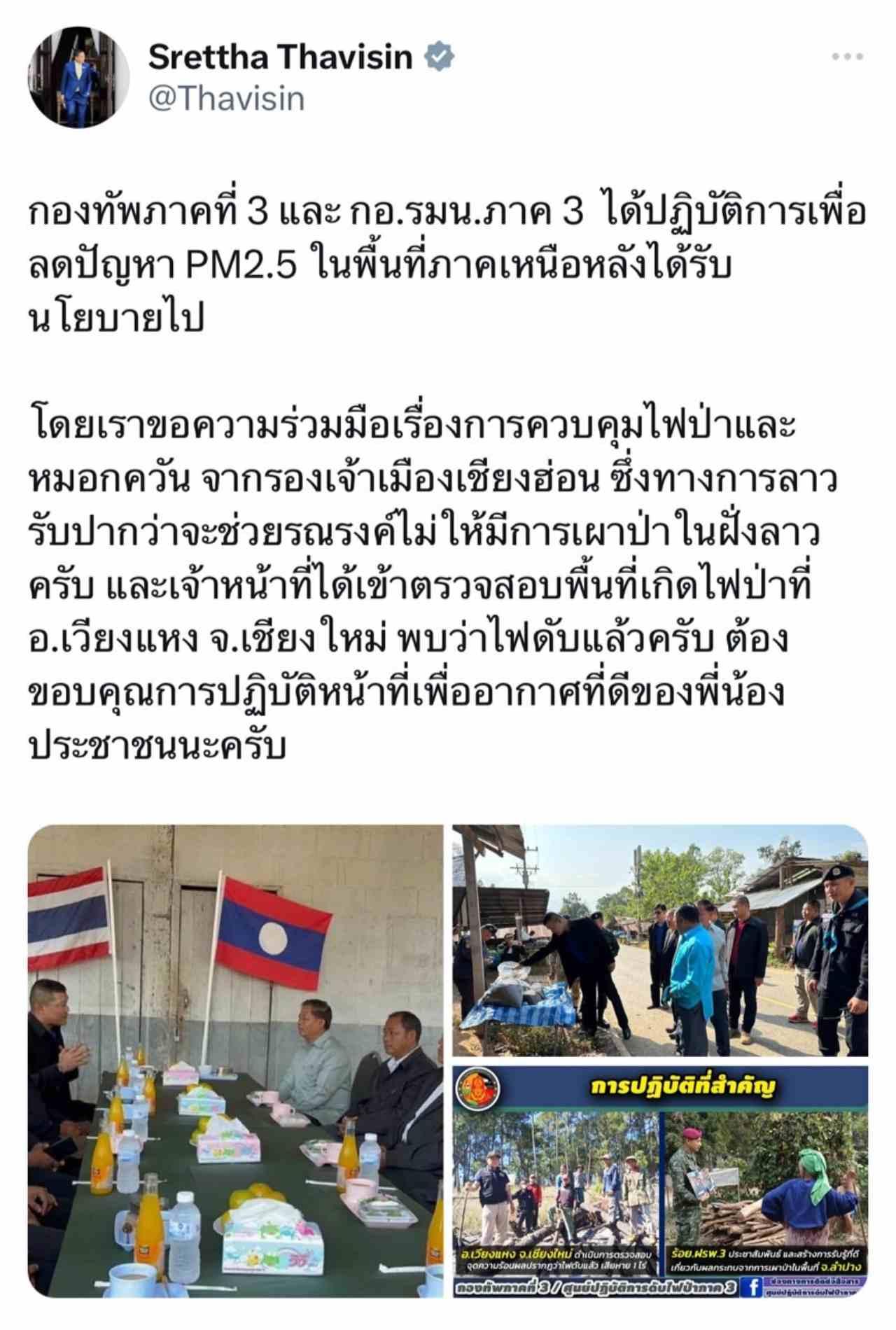 เมื่อเวลา 09.04 น. วันที่ 15 ม.ค. นายเศรษฐา ทวีสิน นายกรัฐมนตรีและ รมว.คลัง โพสต์ข้อความผ่าน X ระบุว่า กองทัพภาคที่ 3 และ กอ.รมน.ภาค 3 ได้ปฏิบัติการเพื่อลดปัญหา PM 2.5 ในพื้นที่ภาคเหนือหลังได้รับนโยบายไป โดยเราขอความร่วมมือเรื่องการควบคุมไฟป่าและหมอกควัน จากรองเจ้าเมืองเชียงฮ่อน ซึ่งทางการลาว รับปากว่าจะช่วยรณรงค์ไม่ให้มีการเผาป่าในฝั่งลาวครับ และเจ้าหน้าที่ได้เข้าตรวจสอบพื้นที่เกิดไฟป่าที่ อ.เวียงแหง จ.เชียงใหม่ พบว่าไฟดับแล้วครับ ต้องขอบคุณการปฏิบัติหน้าที่เพื่ออากาศที่ดีของพี่น้องประชาชนนะครับ