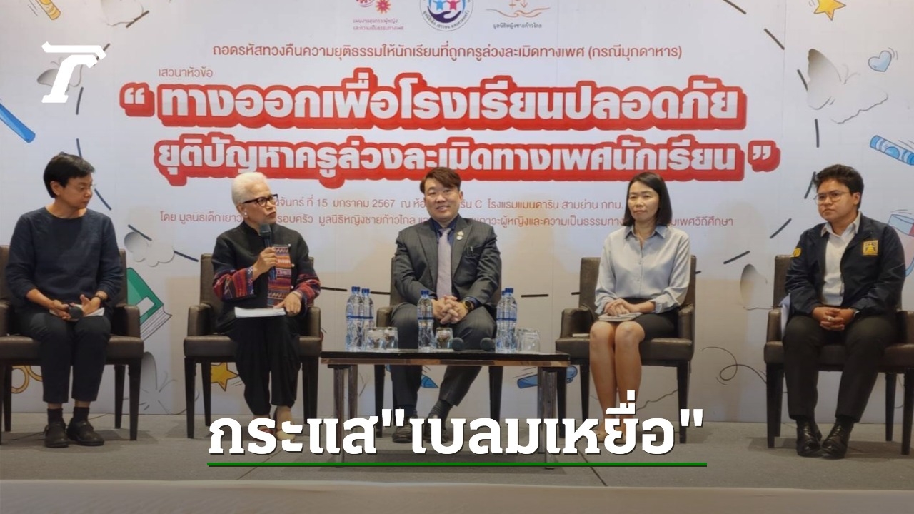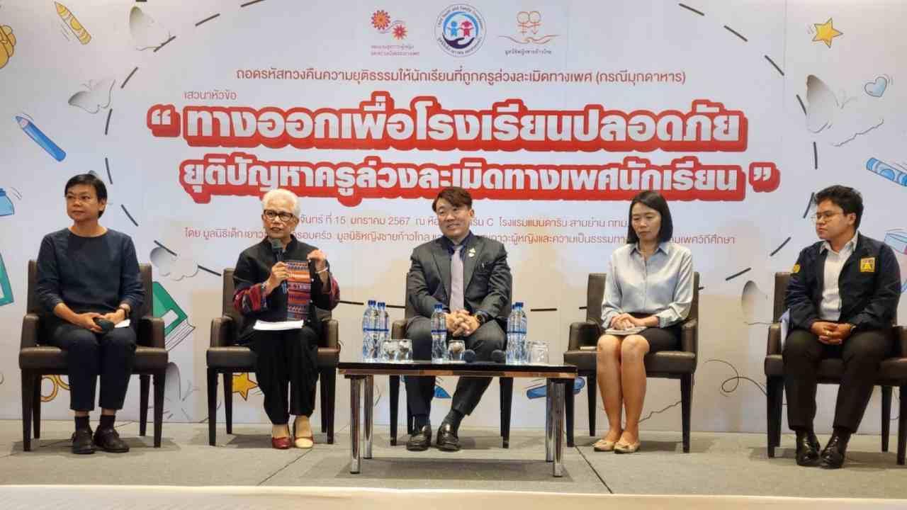 เมื่อวันที่ 15 ม.ค. 67 ที่ โรงแรมแมนดาริน สามย่าน กทม. มูลนิธิเด็ก เยาวชนและครอบครัว มูลนิธิหญิงชายก้าวไกล และแผนงานสุขภาวะผู้หญิงและความเป็นธรรมทางเพศ สมาคมเพศวิถีศึกษา ร่วมกันจัดกิจกรรมถอดรหัสทวงคืนความยุติธรรมให้นักเรียนที่ถูกล่วงละเมิดทางเพศ โดยมีการเสวนา ในหัวข้อ “ทางออกเพื่อโรงเรียนปลอดภัย ยุติปัญหาครูล่วงละเมิดทางเพศนักเรียน” นอกจากนี้ภายในงานยังได้มีกิจกรรมเชิงสัญลักษณ์ “ร่วมกันปกป้องผีเสื้อปีกบาง” พร้อมฉายวีทีอาร์ชุด “เสียงจากผีเสื้อ(ที่ถูกทำร้าย)...หลังคำพิพากษา” ซึ่งเป็นการบอกเล่าถึงปัญหาและการต่อสู้คดีความรุนแรงทางเพศต่อนักเรียนหญิง ที่มีครู และรุ่นพี่เป็นผู้กระทำ จนกระทั่งศาลชั้นต้นพิพากษาตัดสินจำคุกตลอดชีวิตครู 4 คน รุ่นพี่ 2 คน