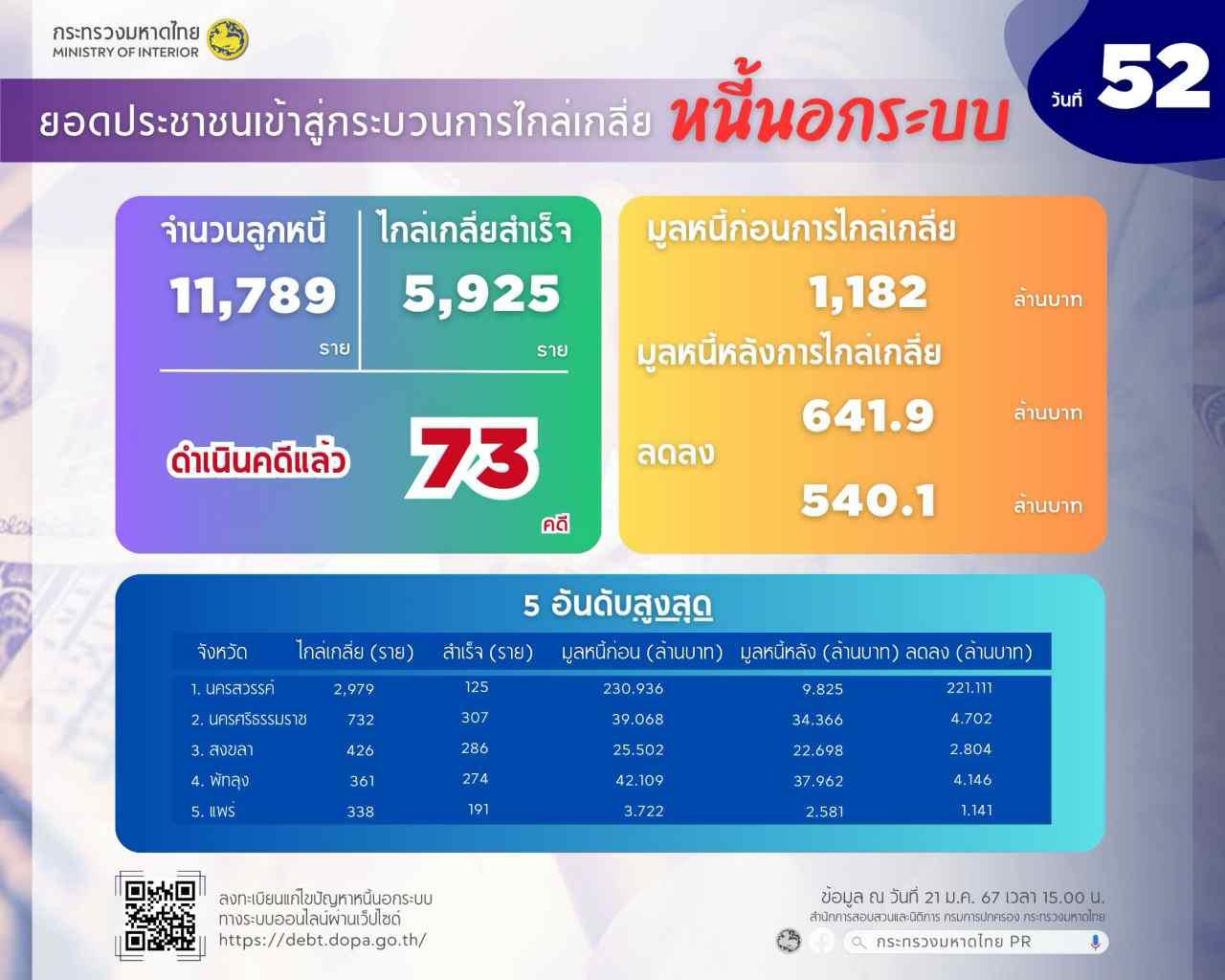 วันที่ 21 ม.ค. 67 นายสุทธิพงษ์ จุลเจริญ ปลัดกระทรวงมหาดไทย เปิดเผยถึงการลงทะเบียนแก้ไขปัญหาหนี้นอกระบบ เป็นวันที่ 52 นับตั้งแต่เปิดลงทะเบียนเมื่อวันที่ 1 ธันวาคม 2566 เป็นต้นมา โดยจากข้อมูลของสำนักการสอบสวนและนิติการ กรมการปกครอง เมื่อเวลา 15.00 น. มีมูลหนี้รวม 8,710.603 ล้านบาท ประชาชนลงทะเบียนแล้ว 132,461 ราย เป็นการลงทะเบียนผ่านระบบออนไลน์ 113,123 ราย และการลงทะเบียน ณ ศูนย์อำนวยการแก้ไขหนี้นอกระบบ 19,338 ราย รวมจำนวนเจ้าหนี้ 97,665 ราย