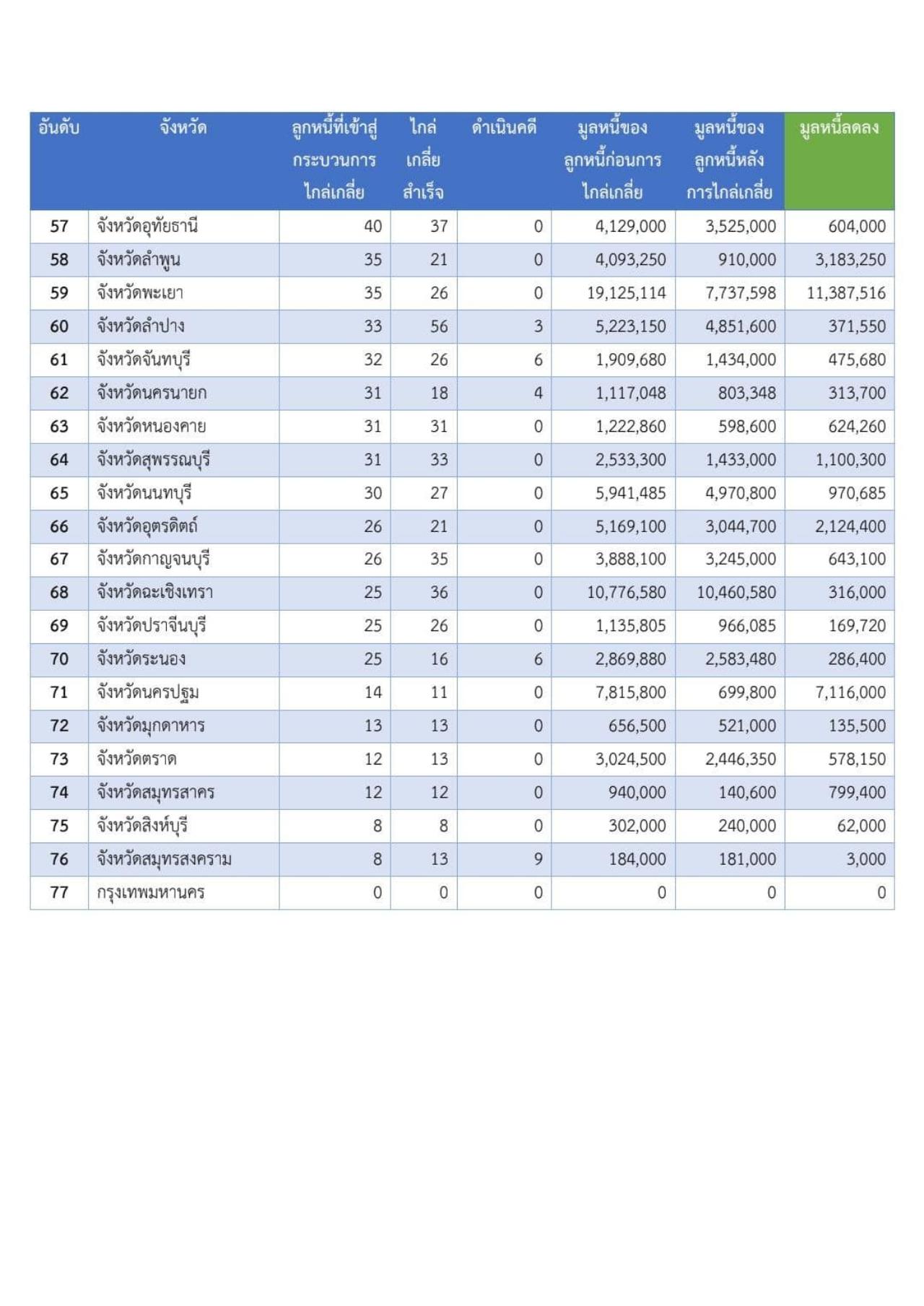 1. กรุงเทพมหานคร ยังคงมากที่สุด มีผู้ลงทะเบียน 11,049 ราย เจ้าหนี้ 7,116 ราย มูลหนี้ 788.062 ล้านบาท