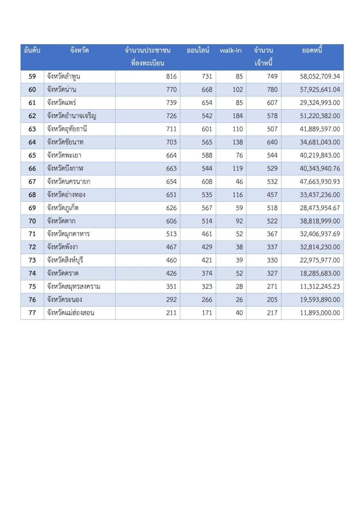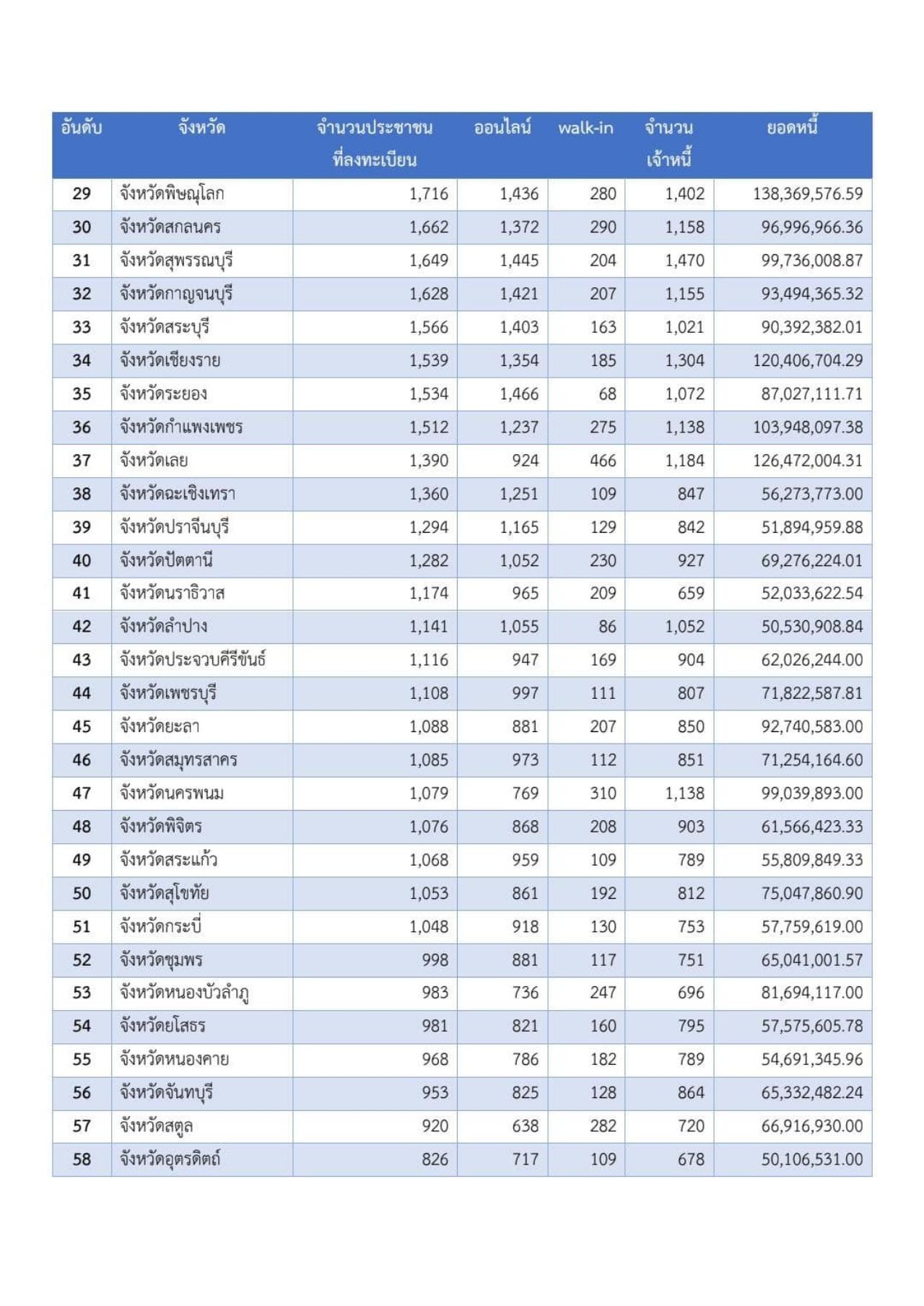 1. จังหวัดแม่ฮ่องสอน มีผู้ลงทะเบียน 211 ราย เจ้าหนี้ 217 ราย มูลหนี้ 11.893 ล้านบาท