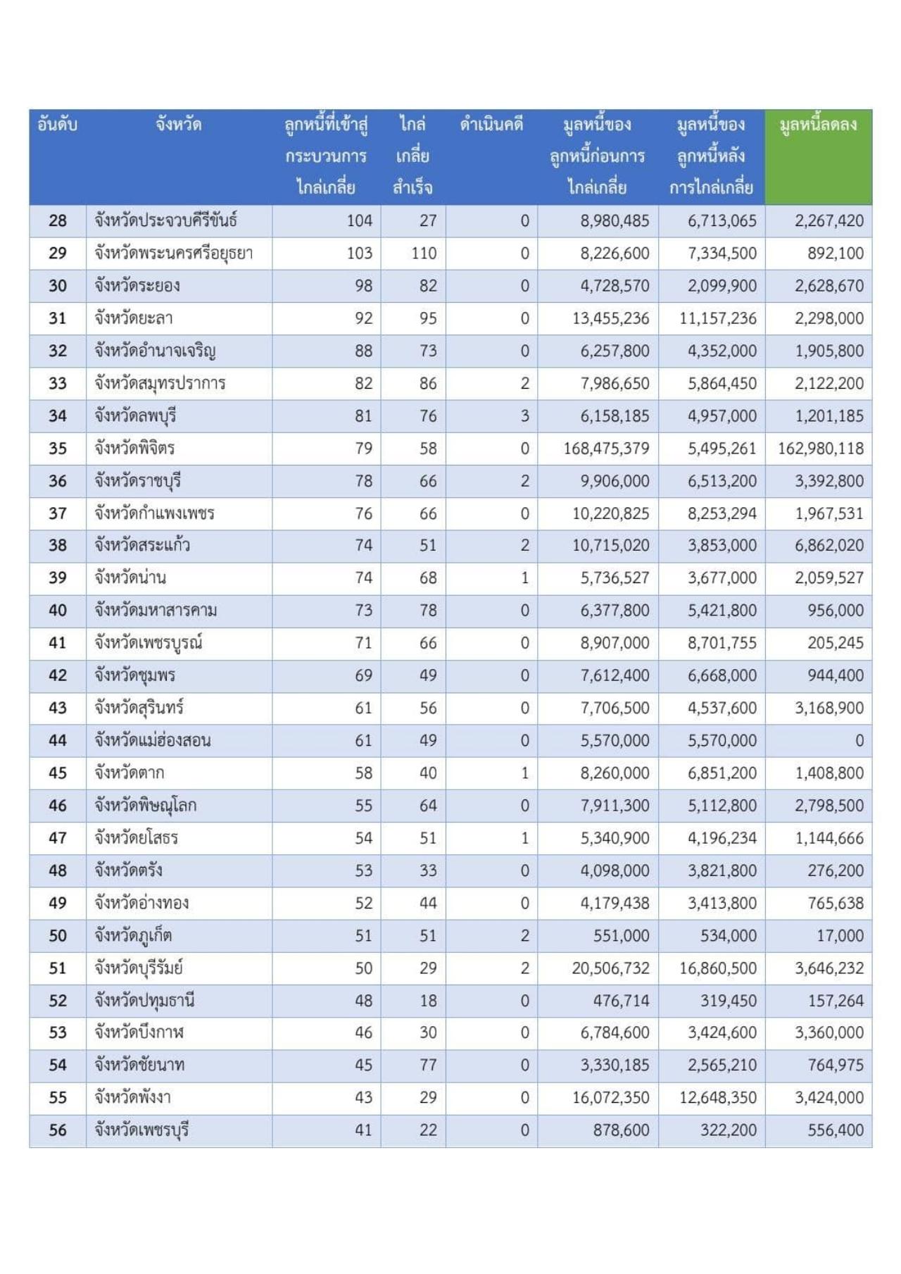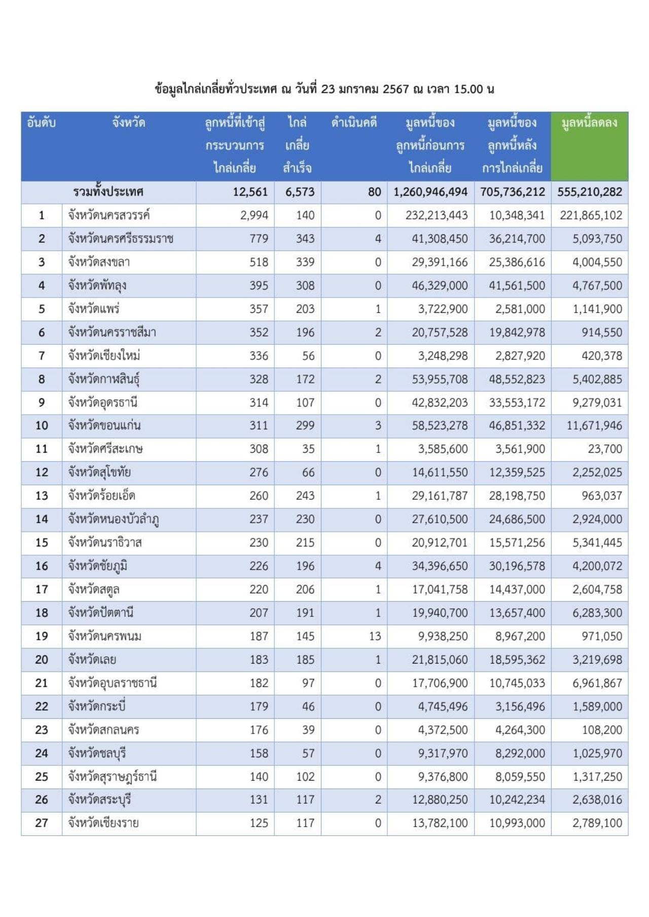 ทางด้านข้อมูลการไกล่เกลี่ยหนี้นอกระบบทั่วประเทศ พบว่า มีลูกหนี้เข้าสู่กระบวนการไกล่เกลี่ยแล้ว 12,561 ราย ไกล่เกลี่ยสำเร็จ 6,573 ราย มูลหนี้ของลูกหนี้ก่อนไกล่เกลี่ย 1,260.946 ล้านบาท หลังการไกล่เกลี่ย 705.736 ล้านบาท มูลหนี้ลดลง 555.210 ล้านบาท ส่วนจังหวัดที่สามารถนำลูกหนี้เข้าสู่กระบวนการไกล่เกลี่ยได้มากที่สุด ยังคงเป็นจังหวัดนครสวรรค์ มีลูกหนี้ที่เข้าสู่กระบวนการไกล่เกลี่ย 2,994 ราย ไกล่เกลี่ยสำเร็จ 140 ราย มูลหนี้ของลูกหนี้ก่อนไกล่เกลี่ย 232.213 ล้านบาท หลังการไกล่เกลี่ย 10.348 ล้านบาท ทำให้มูลหนี้ของพี่น้องประชาชนในจังหวัดนครสวรรค์ลดลง 221.865 ล้านบาท