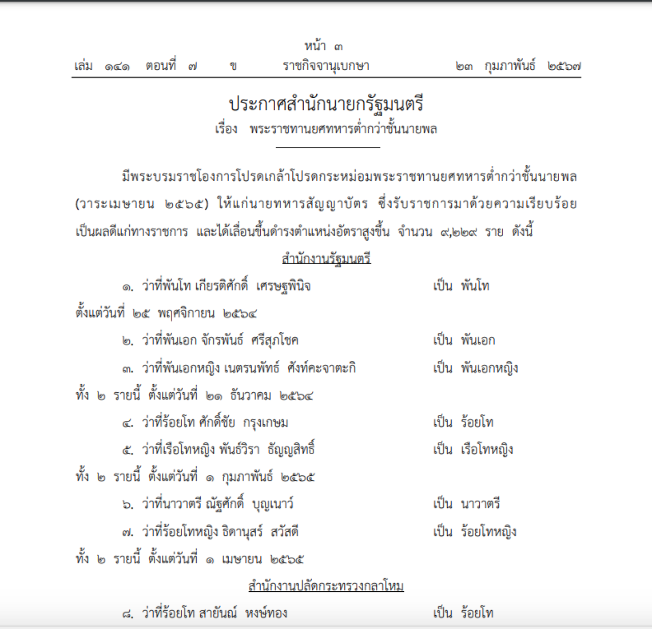ราชกิจจานุเบกษา เผยแพร่ ประกาศสำนักนายกรัฐมนตรี เรื่อง พระราชทานยศทหารต่ำกว่าชั้นนายพล เลื่อนขึ้นดำรงตำแหน่งอัตราสูงขึ้น จำนวน 9,229 ราย