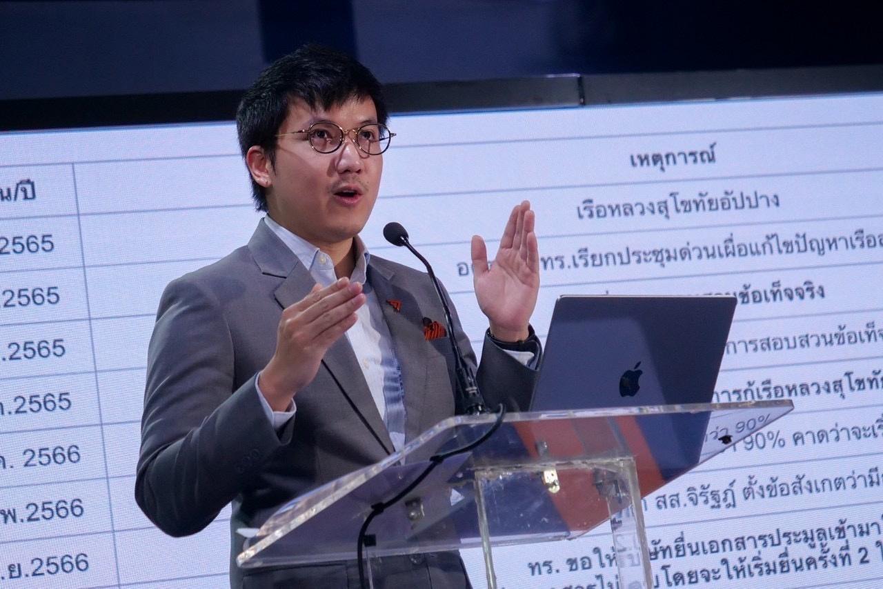 วันที่ 26 กุมภาพันธ์ 2567 ที่อาคารอนาคตใหม่ พรรคก้าวไกล นายชยพล สท้อนดี สส.กรุงเทพฯ เขต 8 พรรคก้าวไกล แถลง Policy Watch หัวข้อ “นิราศ(เรือหลวง)สุโขทัย: จากเรือรบสู่ปะการังเทียม?” โดย นายชยพล ได้ไล่ไทม์ไลน์ของเรือหลวงสุโขทัยที่อับปางลงตั้งแต่วันที่ 18 ธันวาคม 2565 พร้อมกับกำลังพลอีก 106 นาย ซึ่งขณะนั้นกองทัพเรือได้เดินเรือออกจากฐานทัพเรือสัตหีบ จ.ชลบุรี มุ่งหน้าไปร่วมงานเทิดพระเกียรติ พลเรือเอกพระเจ้าบรมวงศ์เธอ พระองค์เจ้าอาภากรเกียรติวงศ์ กรมหลวงชุมพรเขตอุดมศักดิ์ เนื่องในวันครบรอบ 100 ปี วันคล้ายวันประสูติขององค์พระบิดาของกองทัพเรือไทย จนเกิดเหตุการณ์เรือล่ม โดยพบว่ายังมีปัญหาการซ่อมบำรุงของเรือหลวงสุโขทัย เช่น เรื่องการซ่อมบำรุงแผ่นเหล็กที่ถูกกร่อนจนบางต่ำกว่ามาตรฐาน ซึ่งซ่อมไปเพียง 5 จุด จาก 13 จุดที่มีปัญหา แล้วไปซ่อมอีก 10 จุดที่ไม่ได้มีปัญหาอะไร และมีคิวรอการซ่อมอยู่ถึง 19 รายการ