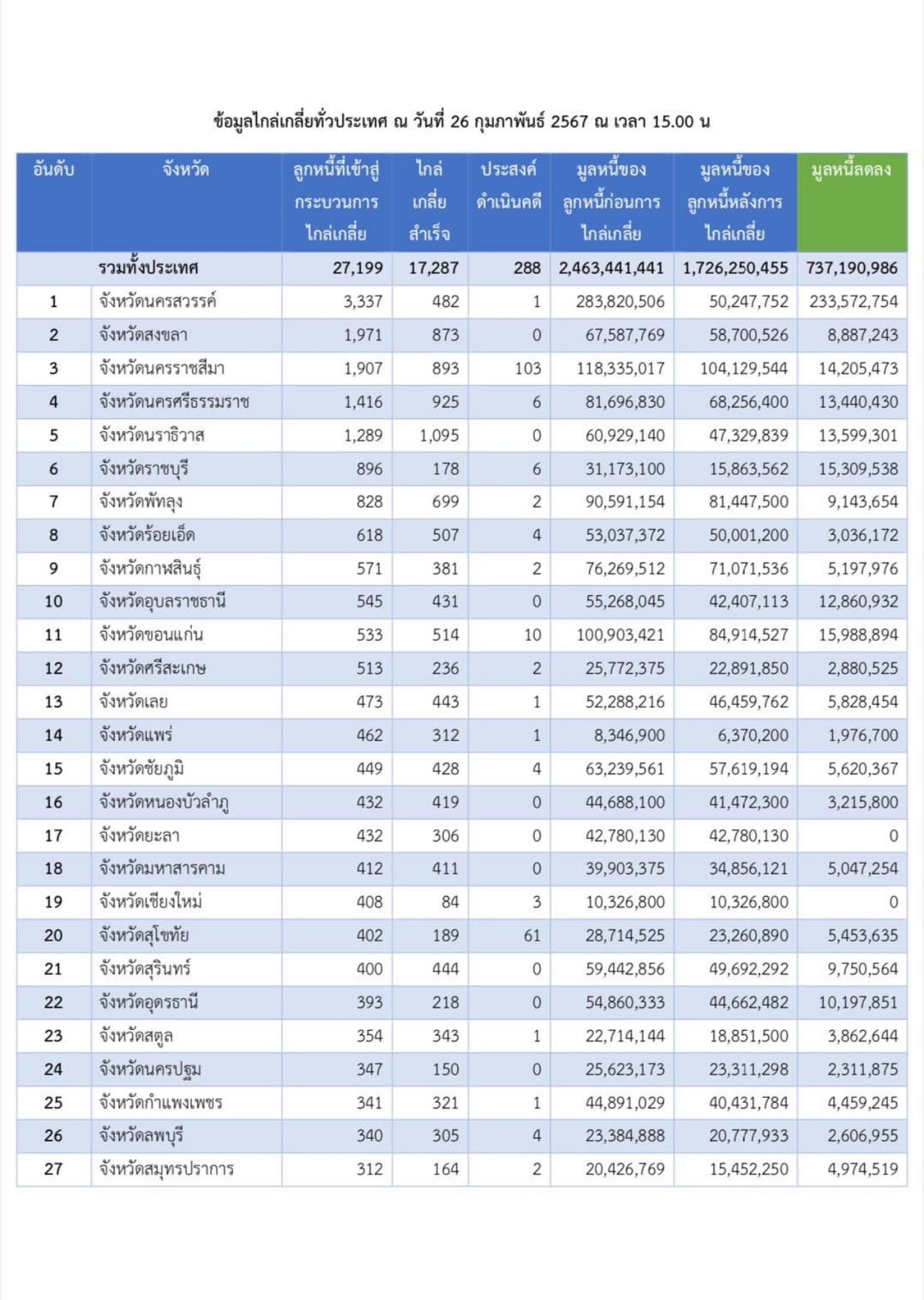 ทั้งนี้ มีลูกหนี้เข้าสู่กระบวนการไกล่เกลี่ยแล้ว 27,199 ราย ไกล่เกลี่ยสำเร็จ 17,287 ราย มูลหนี้ของลูกหนี้ก่อนการไกล่เกลี่ย 2,463.441 ล้านบาท หลังการไกล่เกลี่ย 1,726.250 ล้านบาท มูลหนี้ลดลง 737.190 ล้านบาท โดยจังหวัดที่สามารถนำลูกหนี้เข้าสู่กระบวนการไกล่เกลี่ยได้มากที่สุด คือจังหวัดนครสวรรค์เช่นเดิม มีลูกหนี้ที่เข้าสู่กระบวนการไกล่เกลี่ย 3,337 ราย ไกล่เกลี่ยสำเร็จ 482 ราย มูลหนี้ของลูกหนี้ก่อนไกล่เกลี่ย 283.820 ล้านบาท หลังการไกล่เกลี่ย 50.247 ล้านบาท ทำให้มูลหนี้ของพี่น้องประชาชนในจังหวัดนครสวรรค์ลดลง 233.572 ล้านบาท