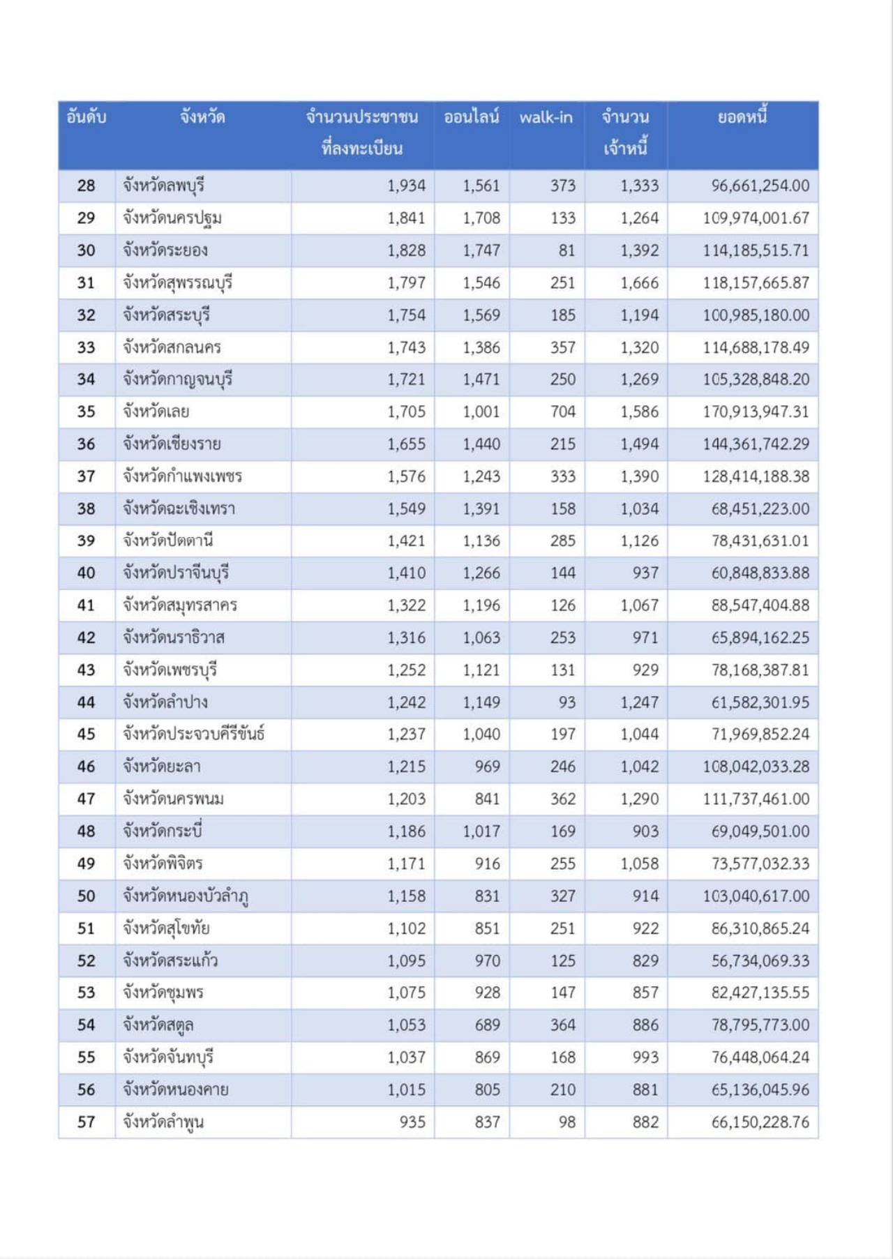 2. จังหวัดนครศรีธรรมราช มีผู้ลงทะเบียน 5,948 ราย เจ้าหนี้ 5,649 ราย มูลหนี้ 406.949 ล้านบาท