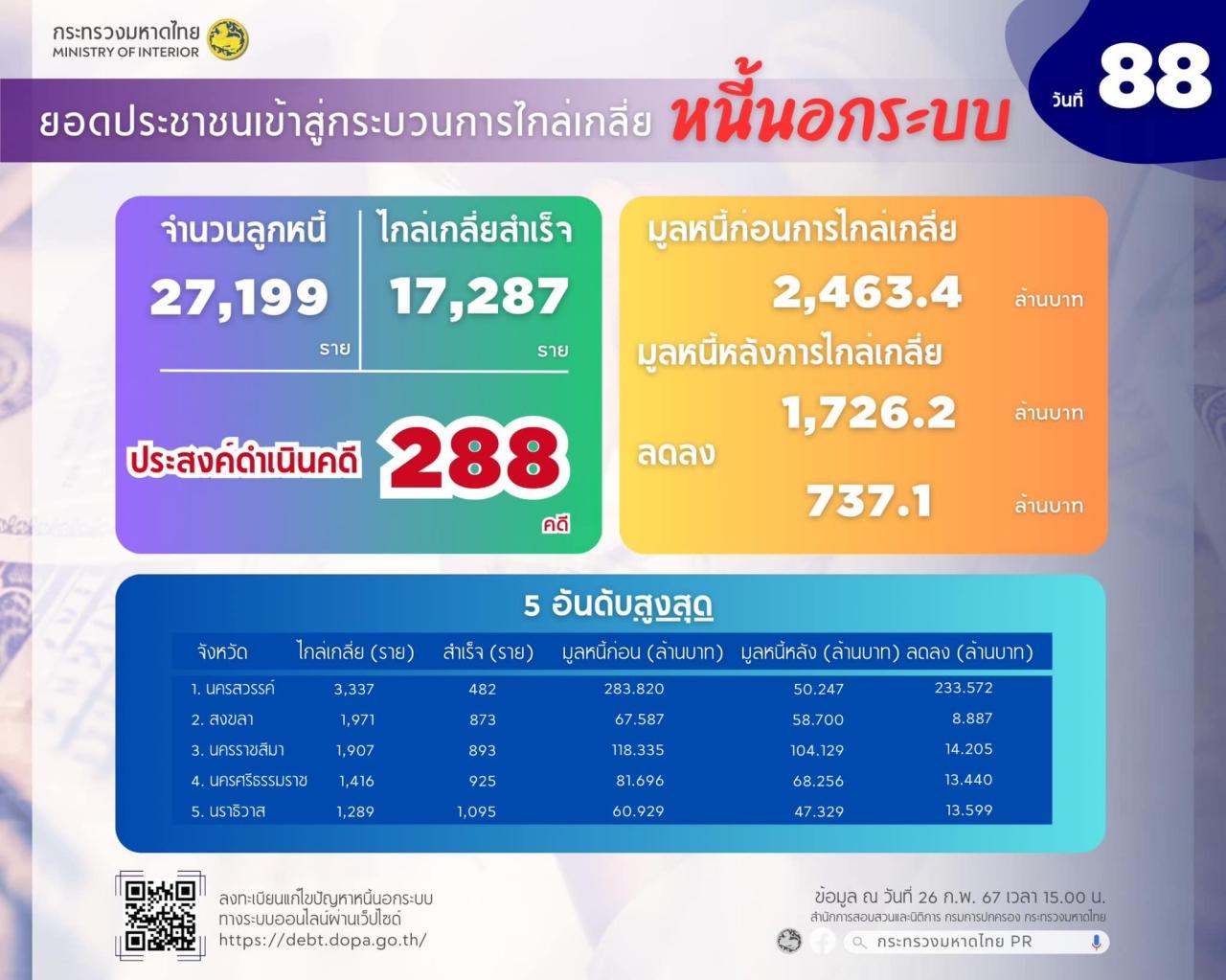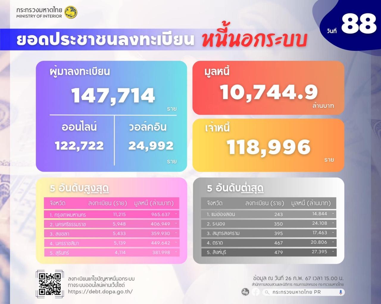 มหาดไทย อัปเดตยอดลงทะเบียนแก้ปัญหาหนี้นอกระบบ วันที่ 88 ประชาชนลงทะเบียนแล้ว 147,714 ราย มูลหนี้รวม 10,744 ล้าน ไกล่เกลี่ยสำเร็จแล้ว 17,287 ราย ย้ำ เหลือเวลาอีก 3 วัน ปิดรับลงทะเบียน 29 ก.พ. นี้