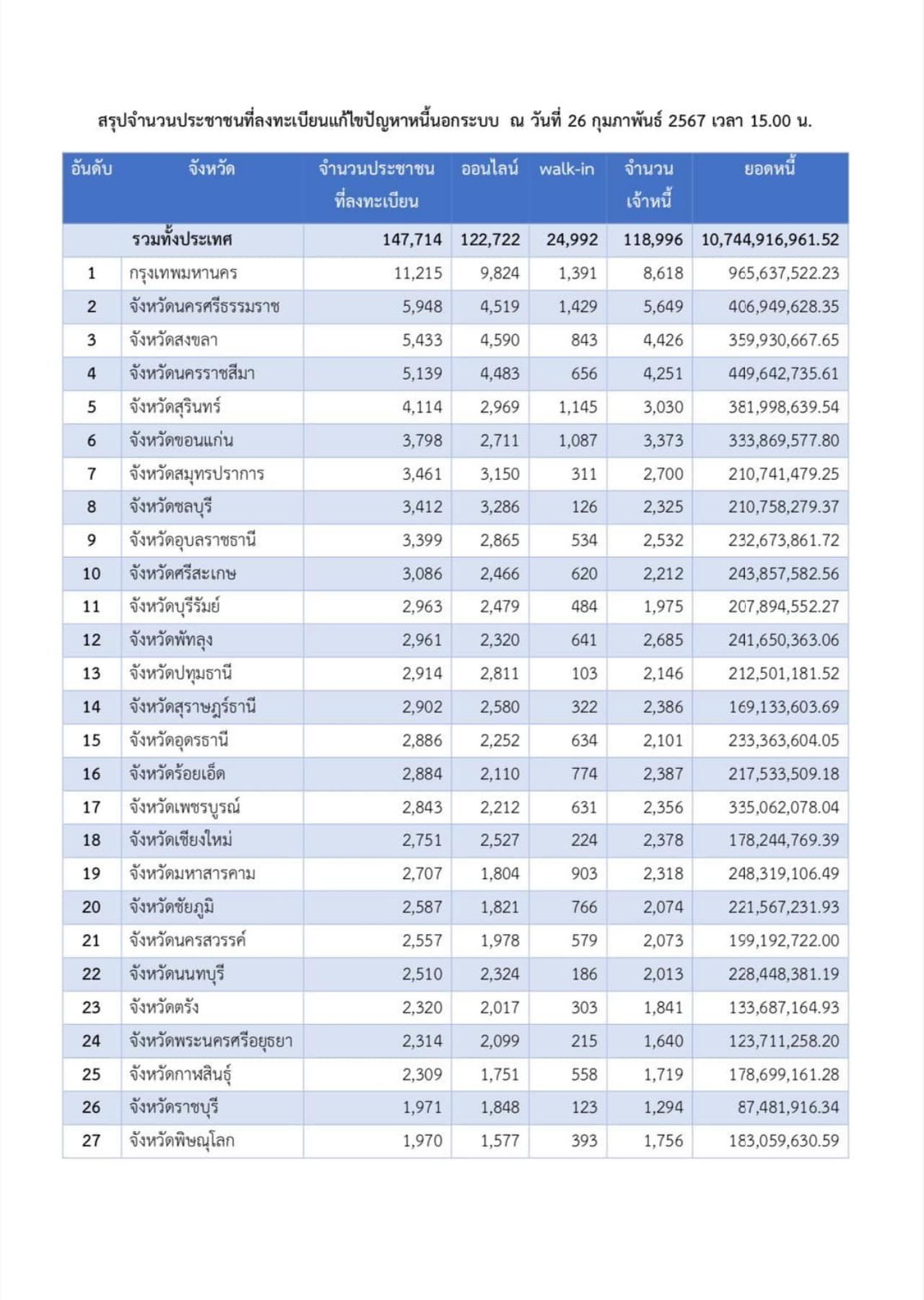 1. กรุงเทพมหานคร ยังคงมีผู้ลงทะเบียนมากที่สุด 11,215 ราย เจ้าหนี้ 8,618 ราย มูลหนี้ 965.637 ล้านบาท