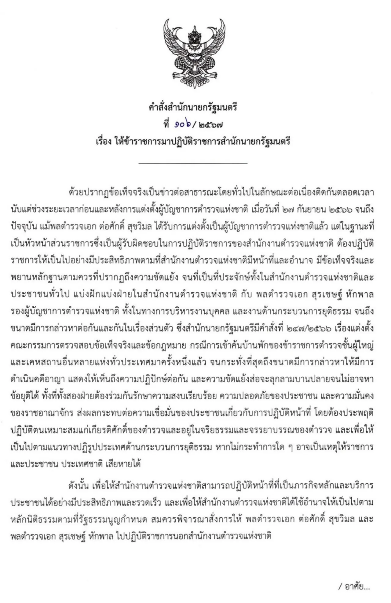 วันที่ 20 มีนาคม 2567 นายเศรษฐา ทวีสิน นายกรัฐมนตรี ลงนามในคำสั่งสำนักนายกรัฐมนตรี ที่ 106/2567 เรื่อง ให้ข้าราชการมาปฏิบัติราชการสำนักนายกรัฐมนตรี โดยมีเนื้อหาว่า ด้วยปรากฏข้อเท็จจริงเป็นข่าวต่อสาธารณะโดยทั่วไปในลักษณะต่อเนื่องติดกันตลอดเวลา นับแต่ช่วงระยะเวลาก่อนและหลังการแต่งตั้งผู้บัญชาการตำรวจแห่งชาติ เมื่อวันที่ 27 กันยายน 2566 จนถึงปัจจุบัน แม้ พลตำรวจเอกต่อศักดิ์ สุขวิมล ได้รับการแต่งตั้งเป็นผู้บัญชาการตำรวจแห่งชาติแล้วแต่ในฐานะที่เป็นหัวหน้าส่วนราชการซึ่งเป็นผู้รับผิดชอบในการปฏิบัติราชการของสำนักงานตำรวจแห่งชาติ ต้องปฏิบัติราชการให้เป็นไปอย่างมีประสิทธิภาพตามที่สำนักงานตำรวจแห่งชาติมีหน้าที่และอำนาจ มีข้อเท็จจริงและพยานหลักฐานตามควรที่ปรากฏถึงความขัดแย้ง จนเป็นที่ประจักษ์ทั้งในสำนักงานตำรวจแห่งชาติและประชาชนทั่วไป แบ่งฝักแบ่งฝ่ายในสำนักงานตำรวจแห่งชาติ กับ พลตำรวจเอกสุรเชษฐ์ หักพาล รองผู้บัญชาการตำรวจแห่งชาติ ทั้งในทางการบริหารงานบุคคล และงานด้านกระบวนการยุติธรรม จนถึงขนาดมีการกล่าวหาต่อกันและกันในเรื่องส่วนตัว