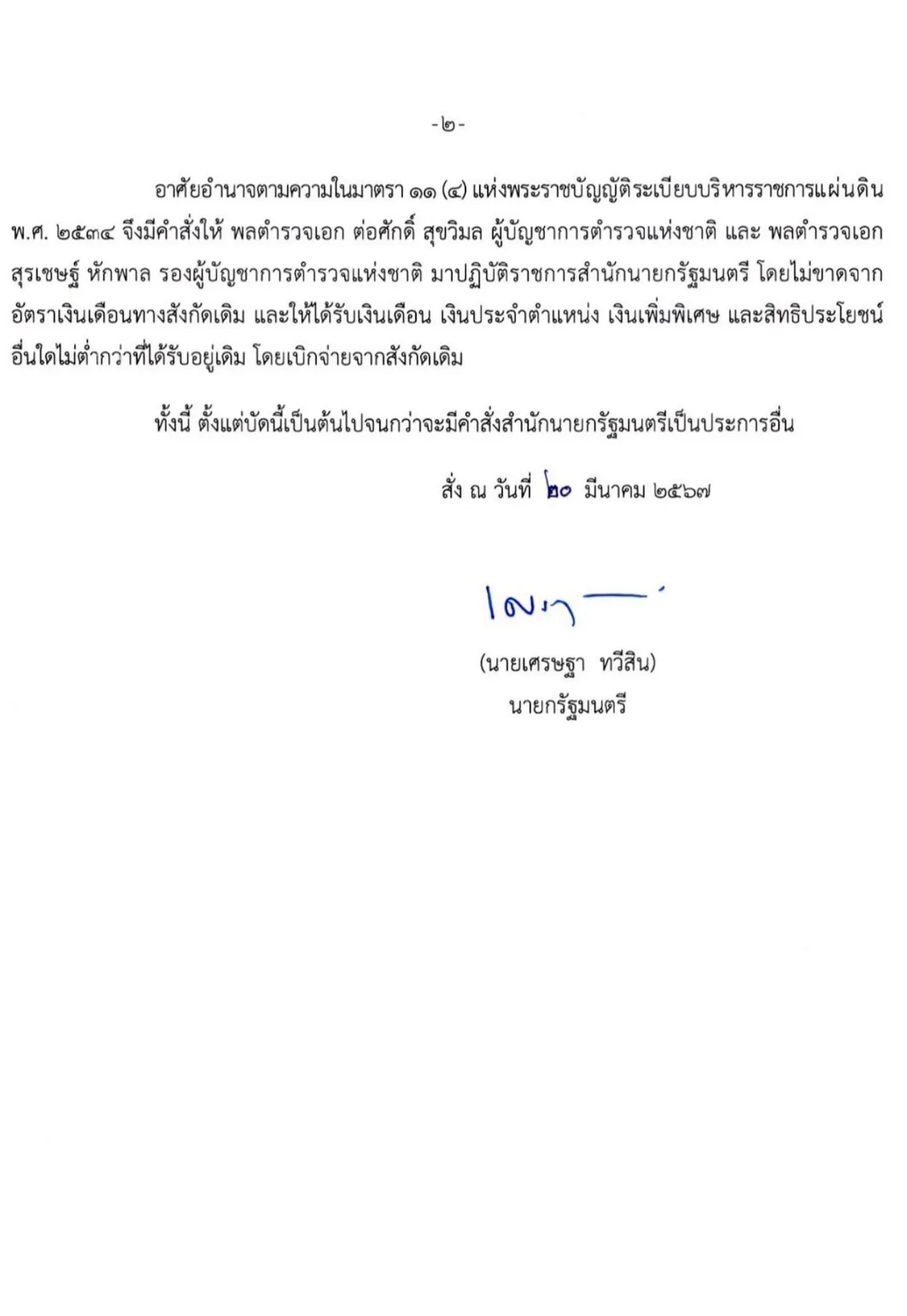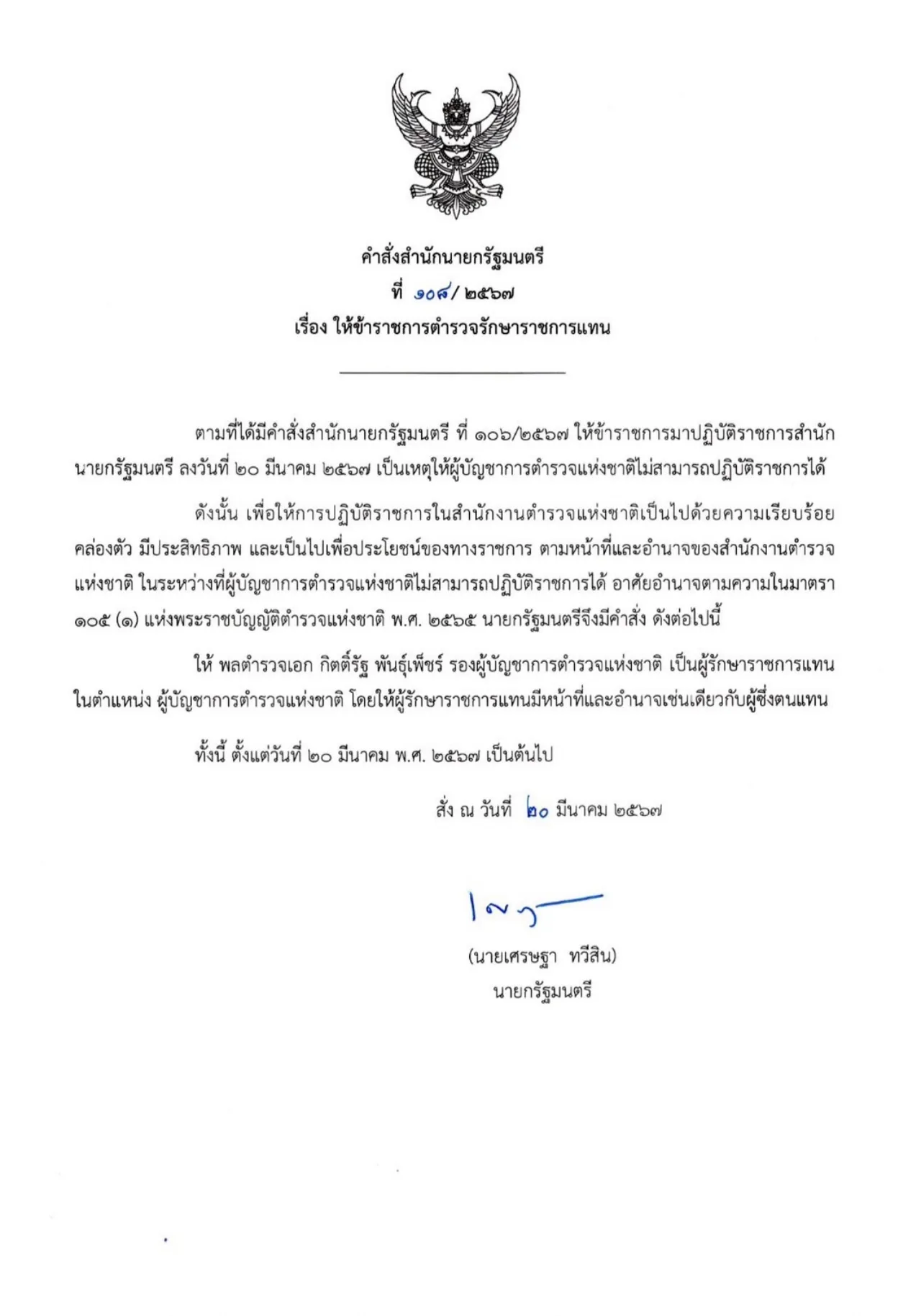 ขณะเดียวกัน นายเศรษฐา ยังได้ลงนามคำสั่งสำนักนายกรัฐมนตรีที่ 108/2567 เรื่อง ให้ข้าราชการตำรวจรักษาราชการแทน มีเนื้อหาว่า ตามที่ได้มีคำสั่งสำนักนายกรัฐมนตรี ที่ 106/2567 ให้ข้าราชการมาปฏิบัติราชการสำนักนายกรัฐมนตรี ลงวันที่ 20 มีนาคม 2567 เป็นเหตุให้ผู้บัญชาการตำรวจแห่งชาติไม่สามารถปฏิบัติราชการได้ ดังนั้น เพื่อให้การปฏิบัติราชการในสำนักงานตำรวจแห่งชาติเป็นไปด้วยความเรียบร้อย คล่องตัว มีประสิทธิภาพ และเป็นไปเพื่อประโยชน์ของทางราชการ ตามหน้าที่และอำนาจของสำนักงานตำรวจแห่งชาติ ในระหว่างที่ผู้บัญชาการตำรวจแห่งชาติไม่สามารถปฏิบัติราชการได้