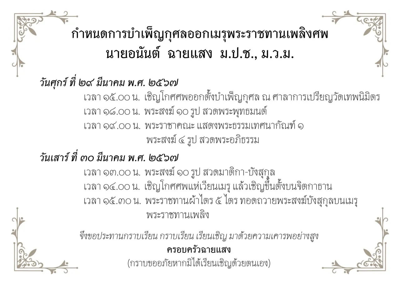 ครอบครัวฉายแสง เตรียมจัดพิธีพระราชทานเพลิงศพ อดีตรัฐมนตรีหลายสมัย “อนันต์ ฉายแสง” 30 มีนาคมนี้ ที่ วัดเทพนิมิตร จ.ฉะเชิงเทรา เจ้าภาพจัดทำนิทรรศการประวัติชีวิตและเส้นทางการเมืองให้ผู้ร่วมงานได้ชม