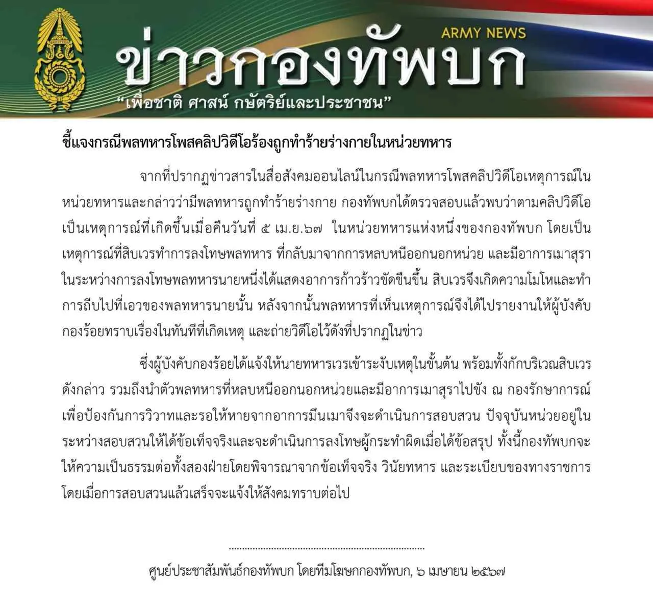 จากที่ปรากฏข่าวสารในสื่อสังคมออนไลน์ในกรณีพลทหารโพสต์คลิปวิดีโอเหตุการณ์ในหน่วยทหารและกล่าวว่า มีพลทหารถูกทําร้ายร่างกาย กองทัพบก ได้ตรวจสอบแล้วพบว่า ตามคลิปวิดีโอ เป็นเหตุการณ์ที่เกิดขึ้นเมื่อคืนวันที่ 5 เม.ย. 2567 ในหน่วยทหารแห่งหนึ่งของกองทัพบก โดยเป็นเหตุการณ์ที่สิบเวรทําการลงโทษพลทหาร ที่กลับมาจากการหลบหนีออกนอกหน่วย และมีอาการเมาสุรา
