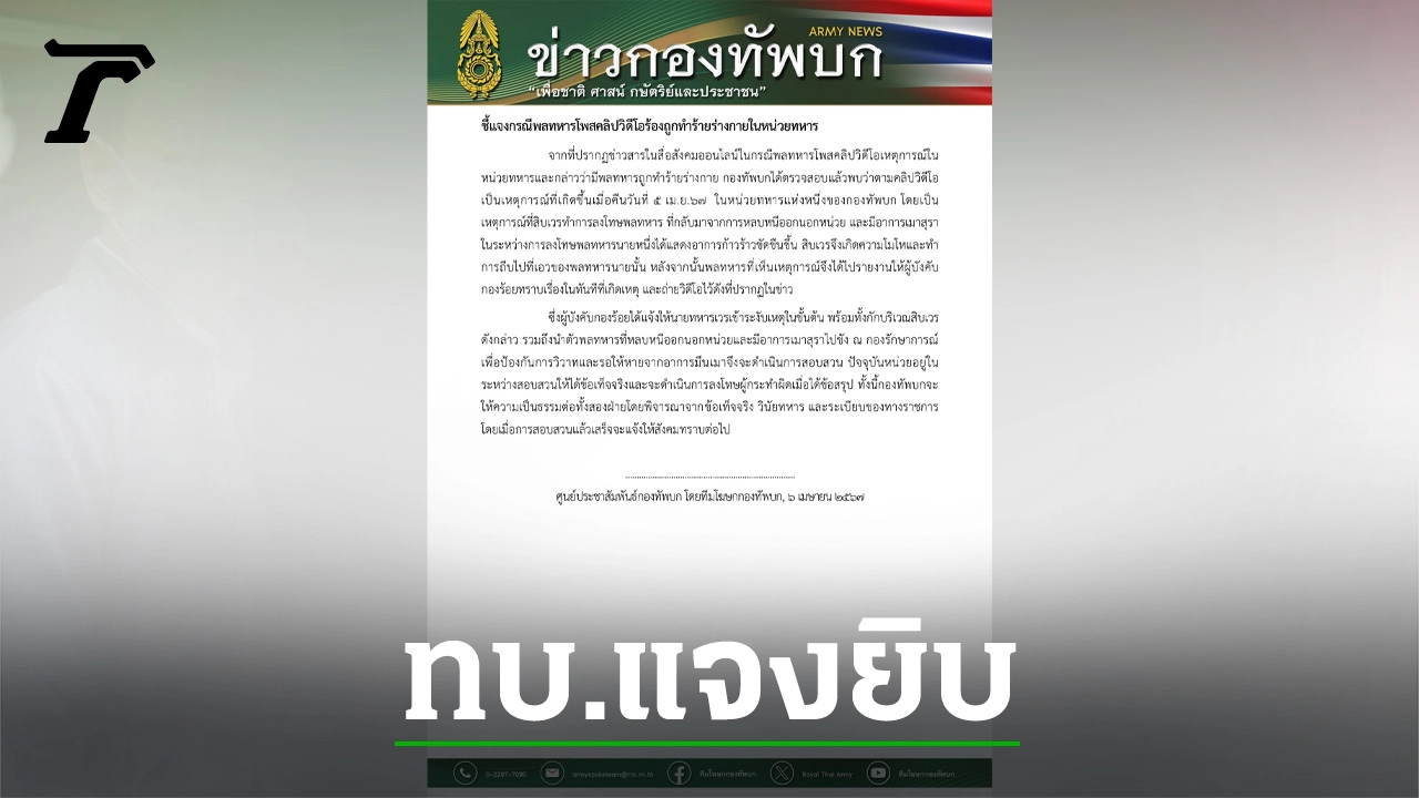 ชี้แจงกรณีพลทหารโพสต์คลิปวิดีโอร้องถูกทําร้ายร่างกายในหน่วยทหาร