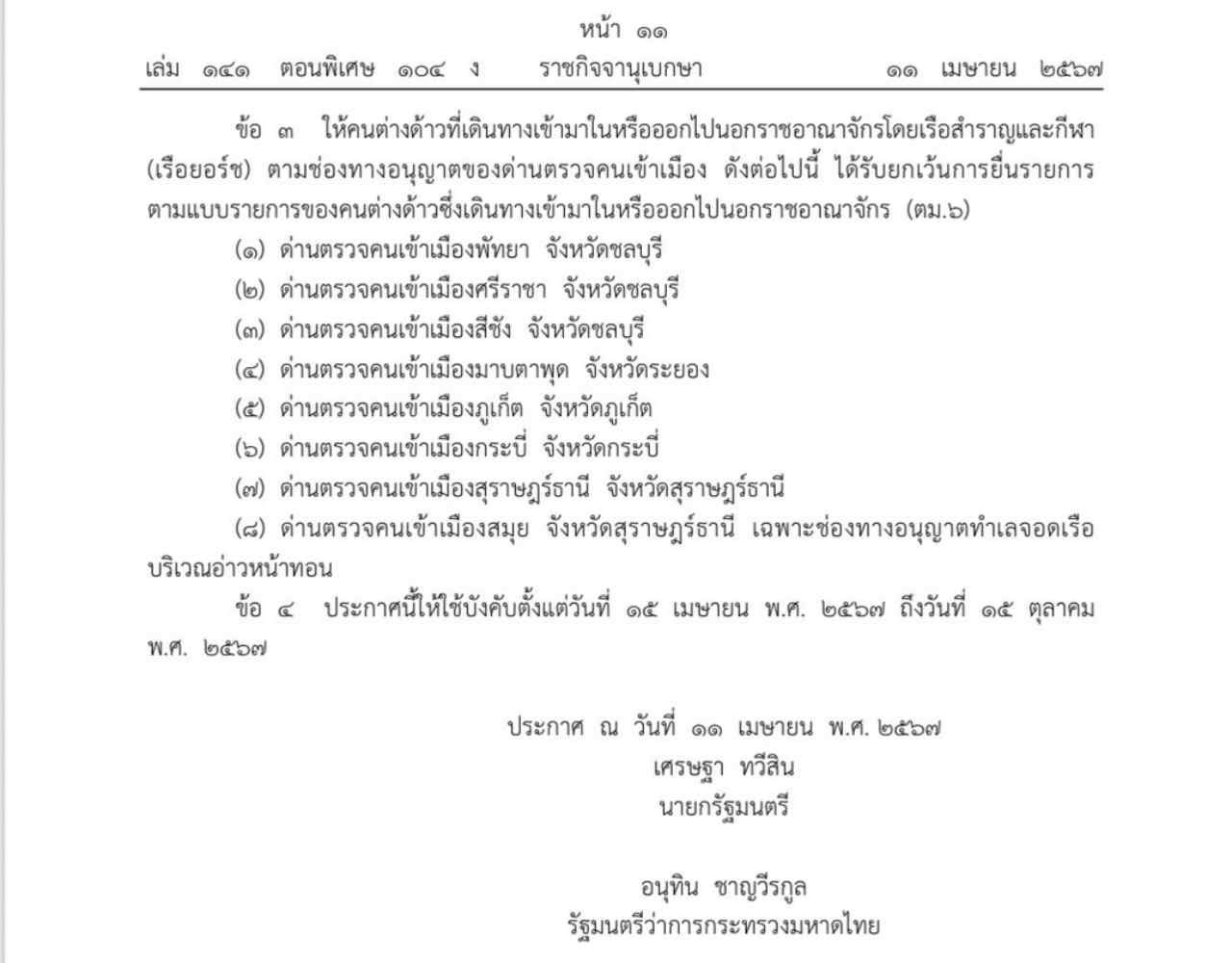 นอกจากนี้ ยังได้ยกเว้นการยื่นแบบ ตม.6 สำหรับคนต่างด้าวซึ่งเดินทางเข้ามาใน หรือออกไปนอกราชอาณาจักร โดยเรือสำราญและกีฬา (เรือยอชต์) ทั้งสิ้น 8 ด่าน ได้แก่ (1) ด่านตรวจคนเข้าเมืองพัทยา จังหวัดชลบุรี (2) ด่านตรวจคนเข้าเมืองศรีราชา จังหวัดชลบุรี (3) ด่านตรวจคนเข้าเมืองสีชัง จังหวัดชลบุรี (4) ด่านตรวจคนเข้าเมืองมาบตาพุด จังหวัดระยอง (5) ด่านตรวจคนเข้าเมืองภูเก็ต จังหวัดภูเก็ต (6) ด่านตรวจคนเข้าเมืองกระบี่ จังหวัดกระบี่ (7) ด่านตรวจคนเข้าเมืองสุราษฎร์ธานี จังหวัดสุราษฎร์ธานี และ (8) ด่านตรวจคนเข้าเมืองสมุย จังหวัดสุราษฎร์ธานี เฉพาะช่องทางอนุญาตทำเลจอดเรือ